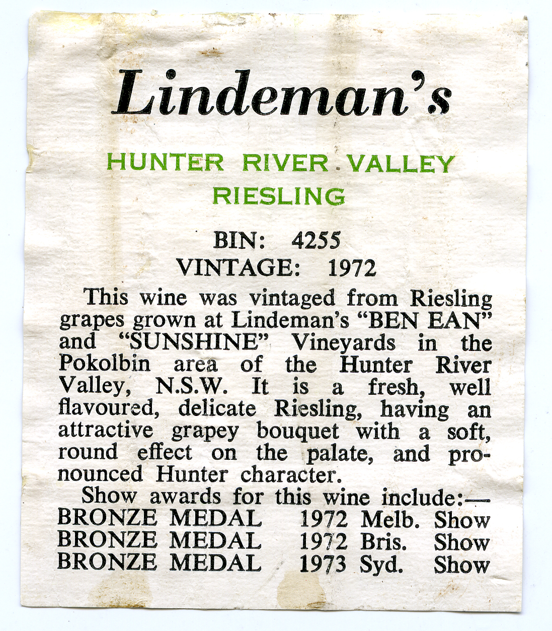 Lindeman's Hunter River Valley Riesling Label (1972) (1972). Living Histories, accessed 19/01/2026, https://livinghistories.newcastle.edu.au/nodes/view/61810