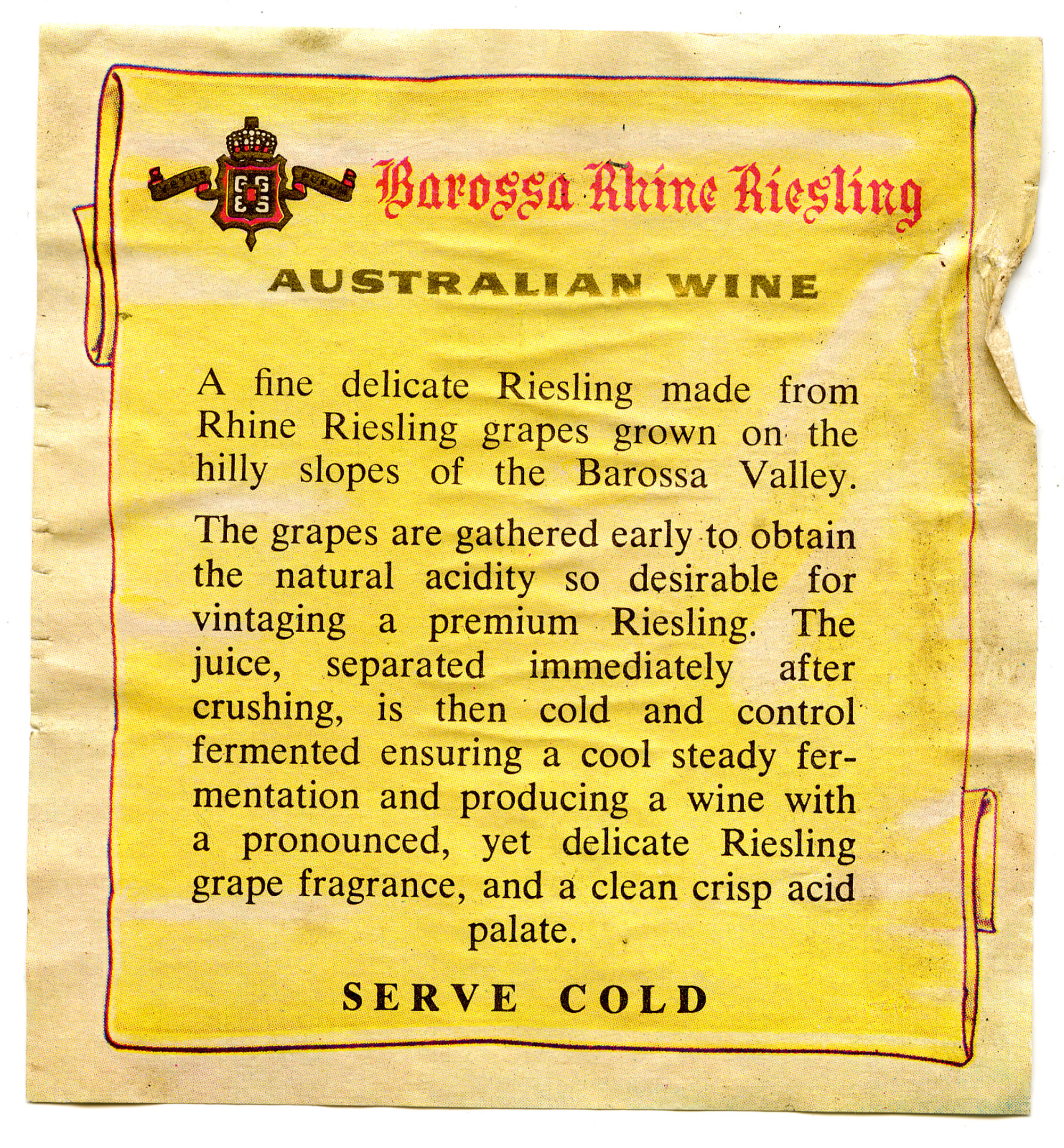 Label reads: "Barossa Rhine Riesling. Australian Wine. A fine delicate Riesling made from Rhine Riesling grapes grown on the hilly slopes of the Barossa Valley..."