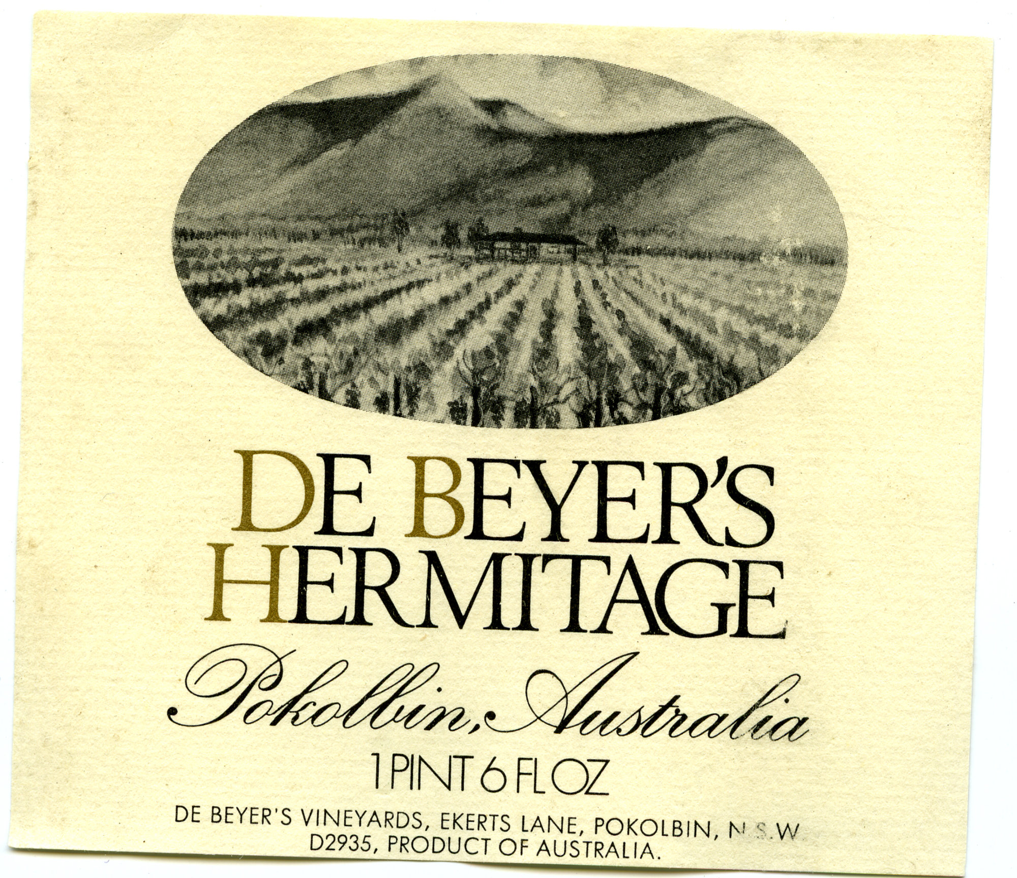 Wine MakerJohn ColvinWineryDe Beyer's VineyardCollectorMorse, AllanType of WineHermitageLanguageEnglishDescriptionLabel reads: "De Beyer's Hermitage. Pokolbin, Australia. 1 PINT 6 FL OZ. De Beyer's Vineyards, Ekerts Lane, Pokolbin, N.S.W. D2935, Product of Australia."