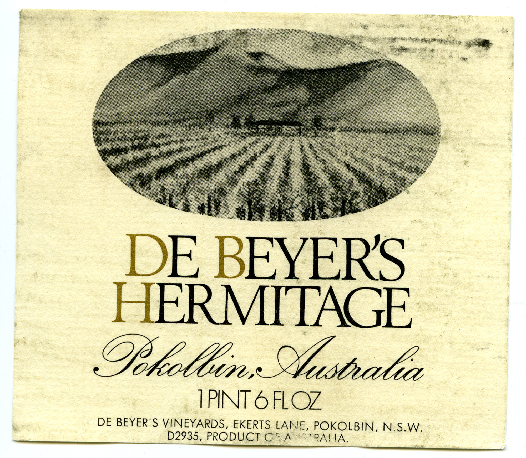 Wine MakerJohn ColvinWineryDe Beyer's VineyardCollectorMorse, AllanType of WineHermitageLanguageEnglishDescriptionLabel reads: "De Beyer's Hermitage. Pokolbin, Australia. 1 PINT 6 FL OZ. De Beyer's Vineyards, Ekerts Lane, Pokolbin, N.S.W. D2935, Product of Australia."