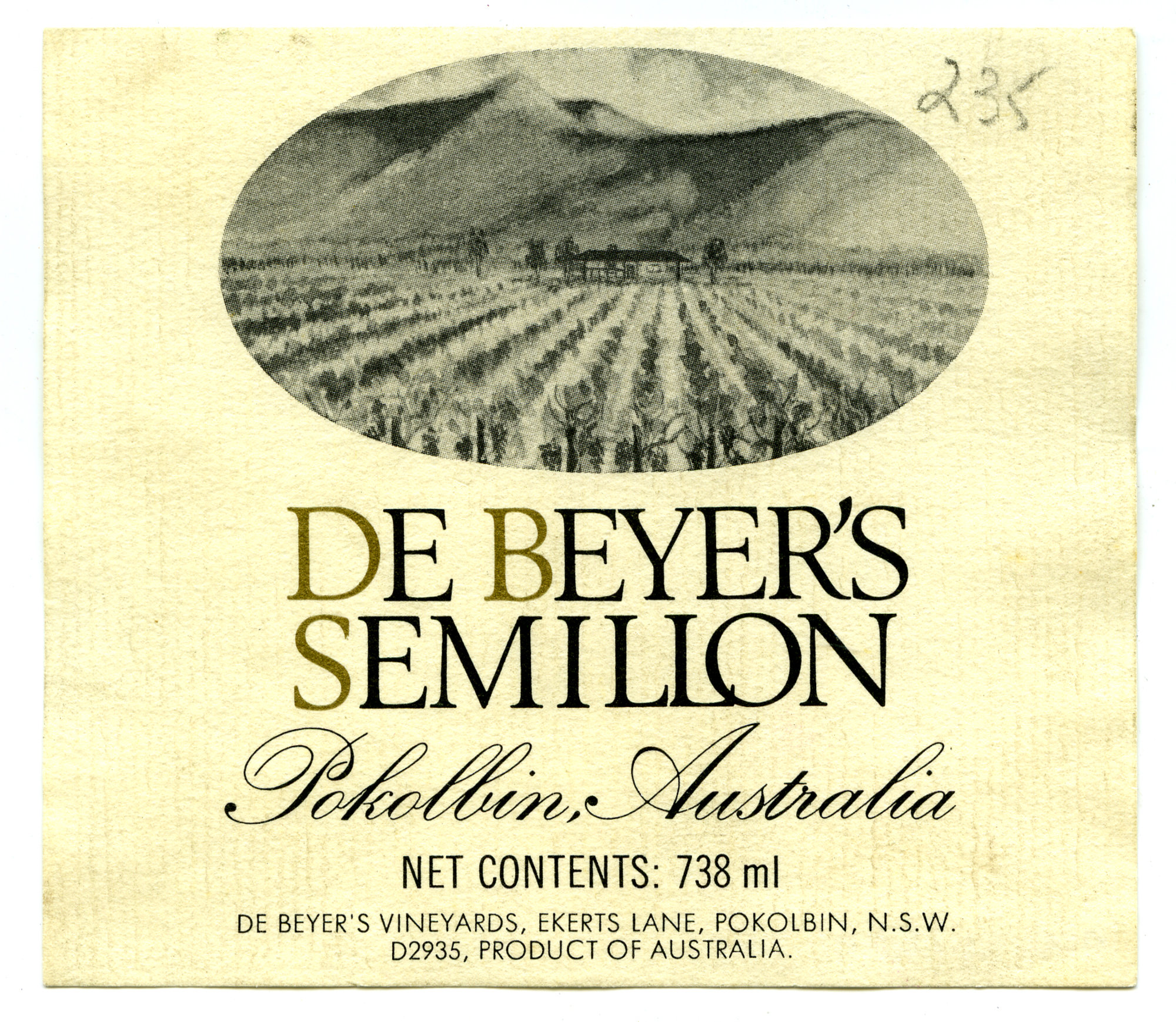 Label reads: "De Beyer's Semillon. Pokolbin, Australia. Net Contents:738ml. De Beyer's Vineyards, Ekerts Lane, Pokolbin, N.S.W. D2935, Product of Australia."