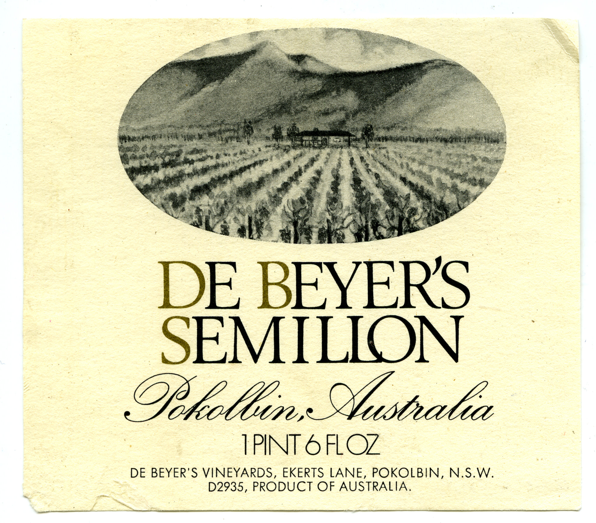 Label reads: "De Beyer's Semillon. Pokolbin, Australia. 1 PINT 6 FL OZ. De Beyer's Vineyards, Ekerts Lane, Pokolbin, N.S.W. D2935, Product of Australia."