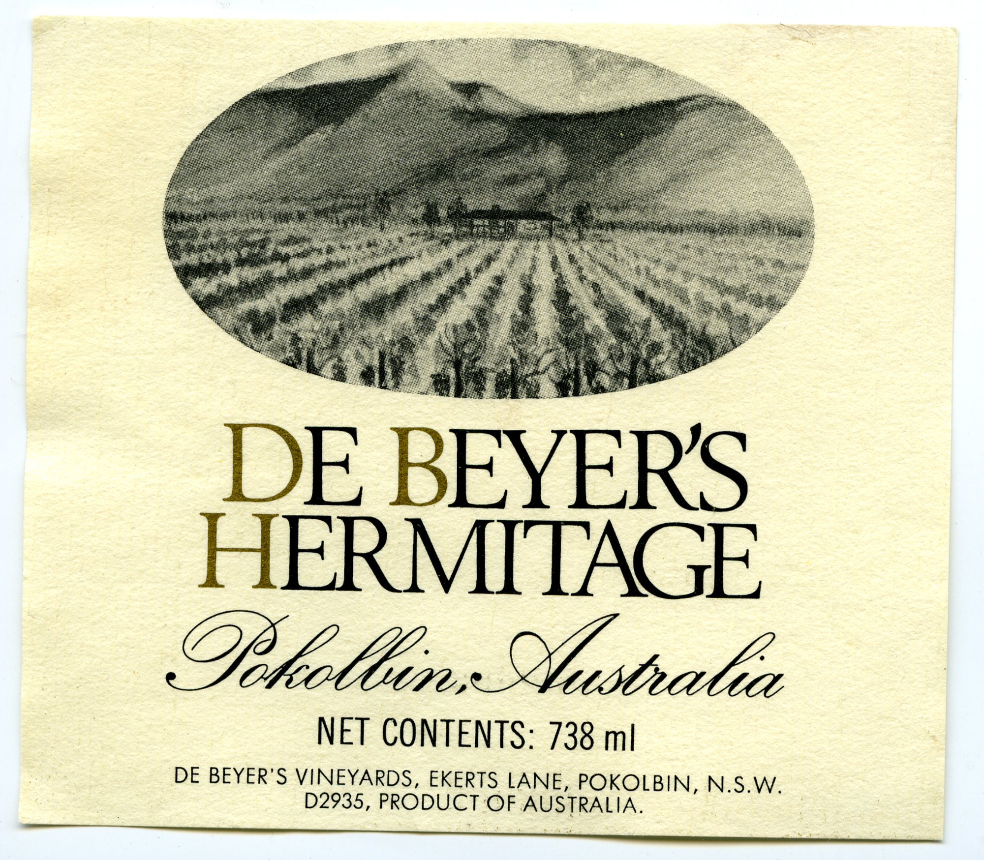Label reads: "De Beyer's Hermitage. Pokolbin, Australia. Net Contents:738ml. De Beyer's Vineyards, Ekerts Lane, Pokolbin, N.S.W. D2935, Product of Australia."