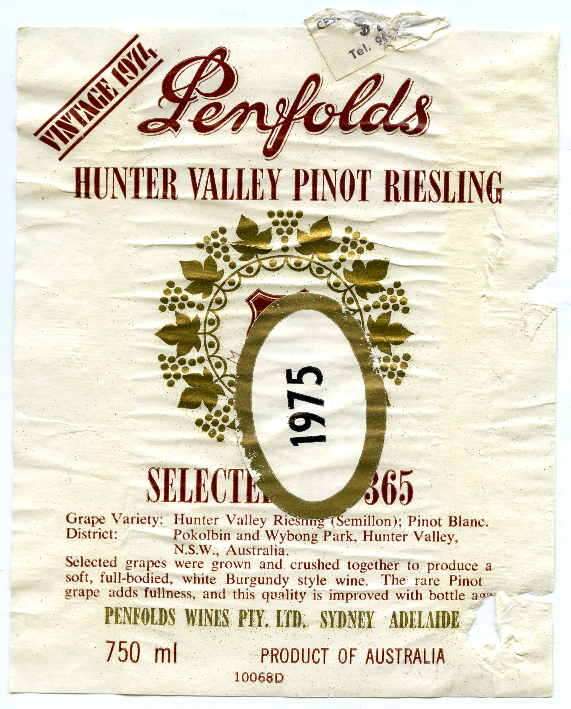 Penfolds Hunter Valley Pinot Riesling Label (1975) (1975). Living Histories, accessed 11/03/2026, https://livinghistories.newcastle.edu.au/nodes/view/62060