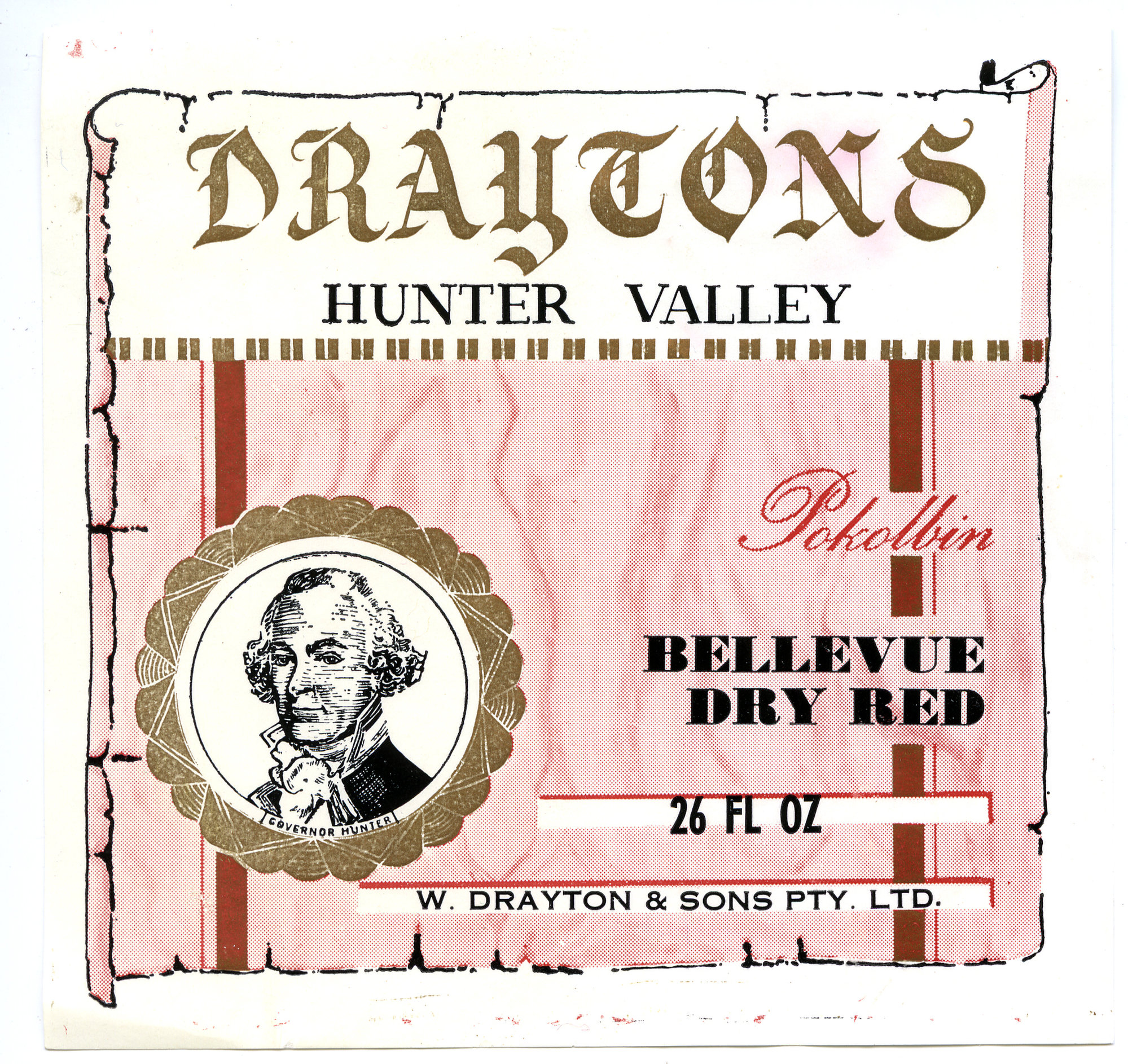 Label reads: "Draytons Hunter Valley Pokolbin. Bellevue Dry Red. 26 FL OZ. W. Drayton and Sons Pty. Ltd. D2403."