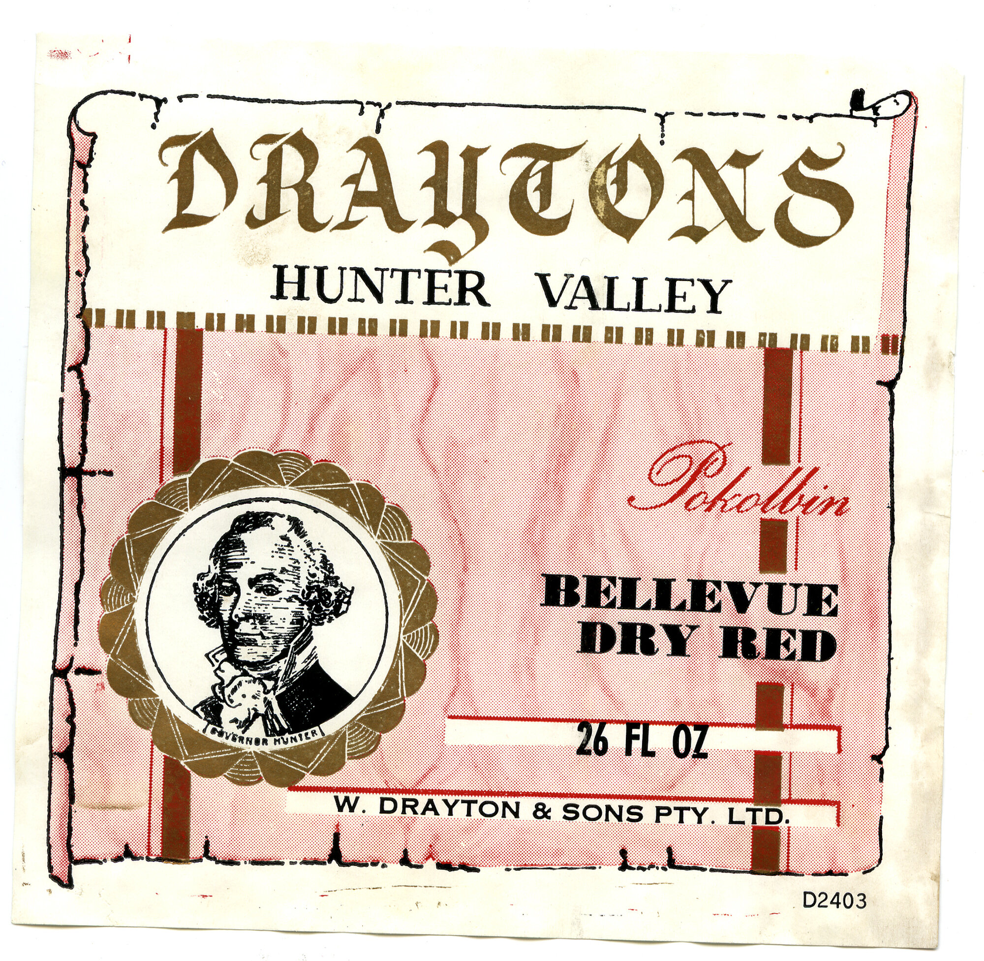 Label reads: "Draytons Hunter Valley Pokolbin. Bellevue Dry Red. 26 FL OZ. W. Drayton and Sons Pty. Ltd. D2403."