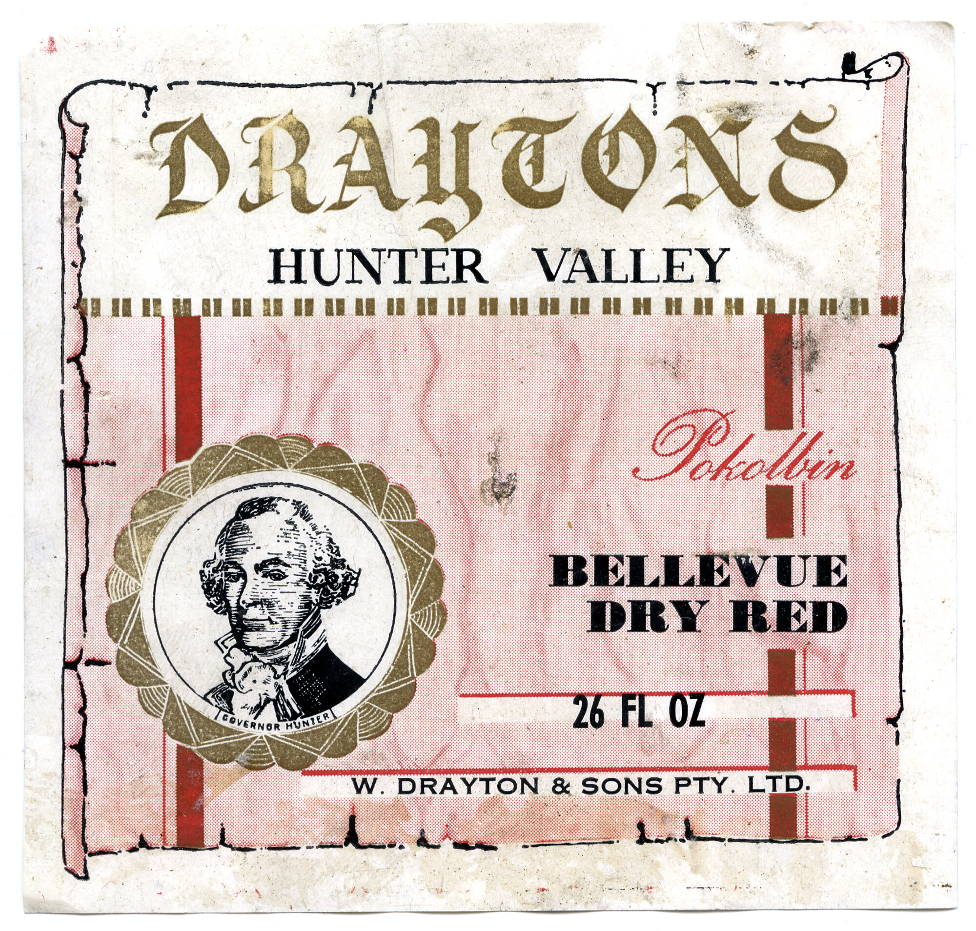 Label reads: "Draytons Hunter Valley Pokolbin. Bellevue Dry Red. 26 FL OZ. W. Drayton and Sons Pty. Ltd. D2403."