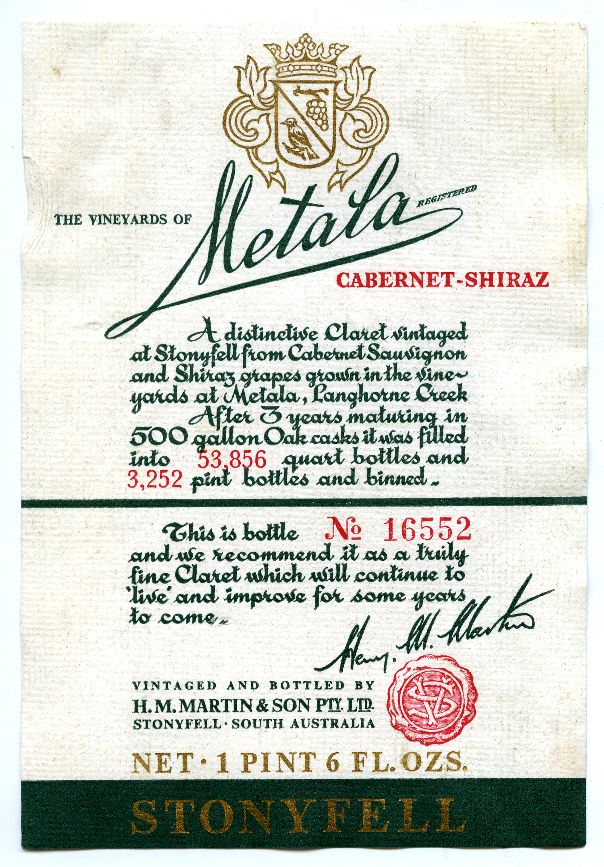 Label reads: "The Vineyards of Metala registered Cabernet-Shiraz A distinctive Claret vintaged at stoneyfell from Cabernet Sauvigon and Shiraz grapes grown in the vineyards at Metala, Langhorne Creek After 3 years maturing in 500 gallon Oak Casks it was filled into 53,856 quart bottles and 3,252 pint bottles and binned This is bottle No.16552 and we recommend it as a truly fine Claret which will continue live and improve for some years to come Vintaged and bottled by H.M. Martin and Son Pty. Ltd. Stoneyfell South Australia Net 1 pint 6 Fl Ozs Stoneyfell"
