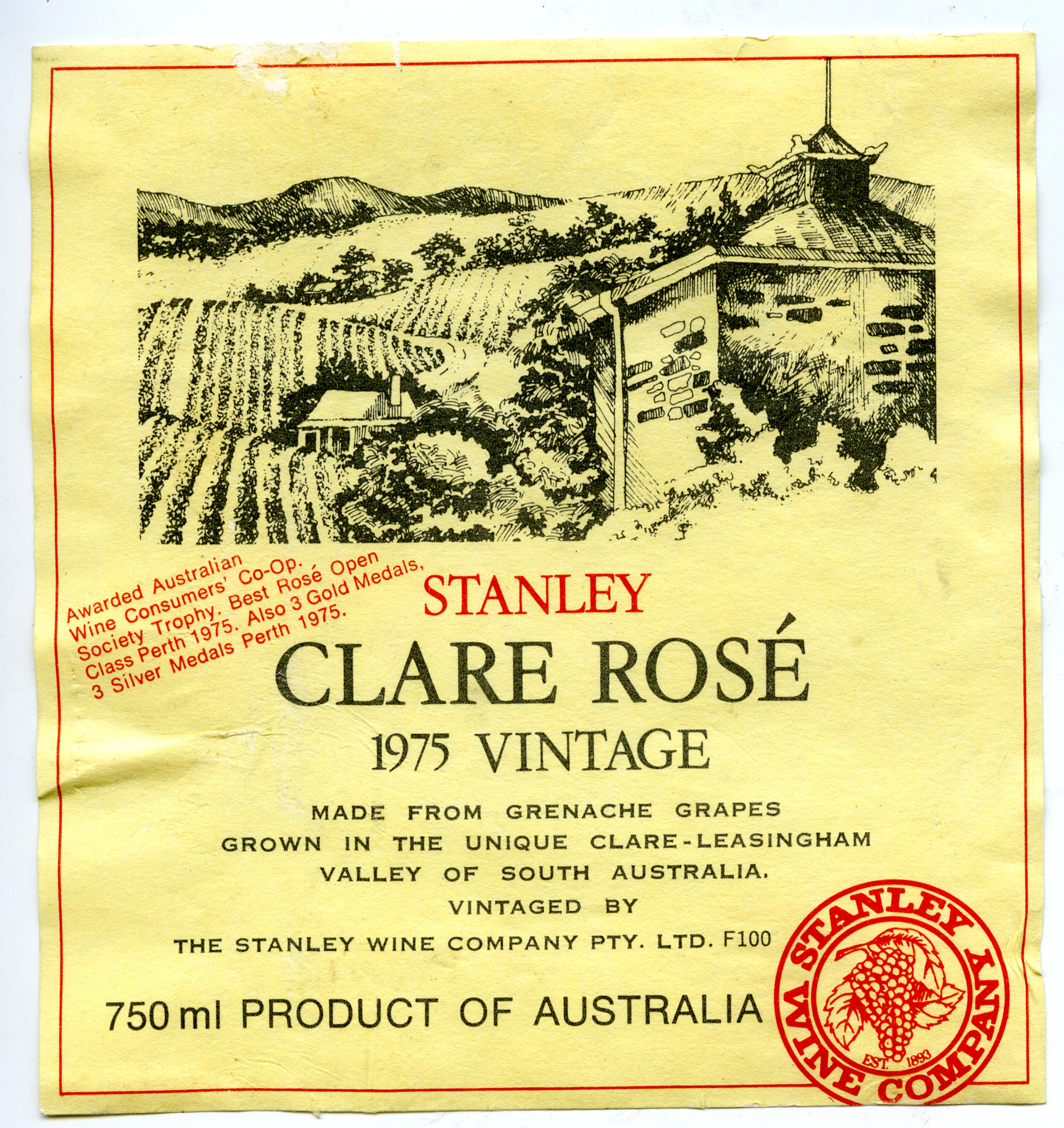 Label reads: "STANLEY CLARE ROSE 1975 VINTAGE Made from Grenache Grapes grown in the unique Clare-Leasingham Valley of South Australia Vintaged by The Stanley Wine Company Pty. Ltd. F100 Awarded Australian Wine Consumers' Co-Op Society Trophey. Best Rose Open Class Perth 1975. Also 3 Gold Medals, 3 Silver Medals Perth 1975. 750ml Product of Australia"