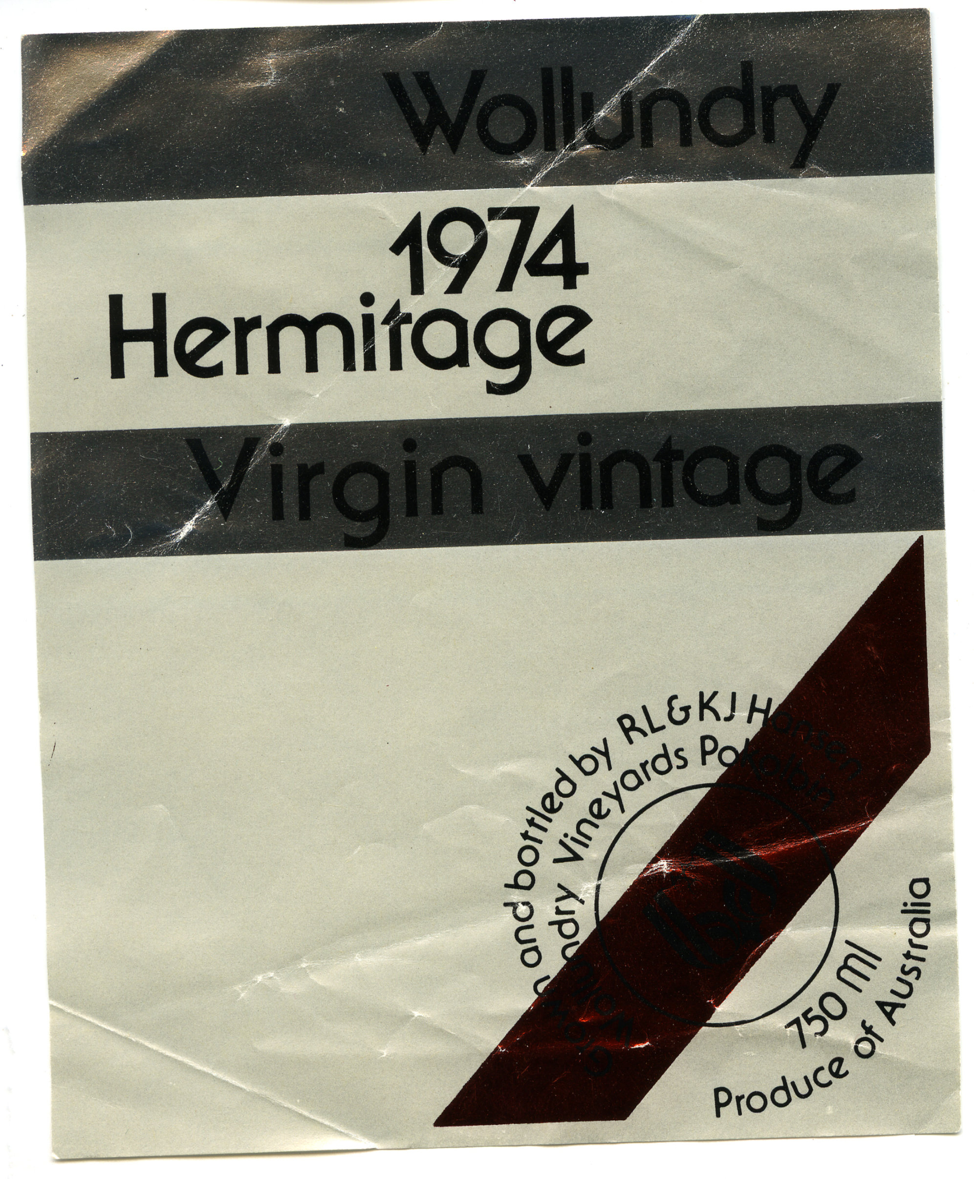 Label reads: "WOLLUNDRY 1974 HERMITAGE Virgin Vintage Grown and Bottled by RL AND KJ Hanson Wollundry Vineyards Pokolbin 750ml Produce of Australia"
