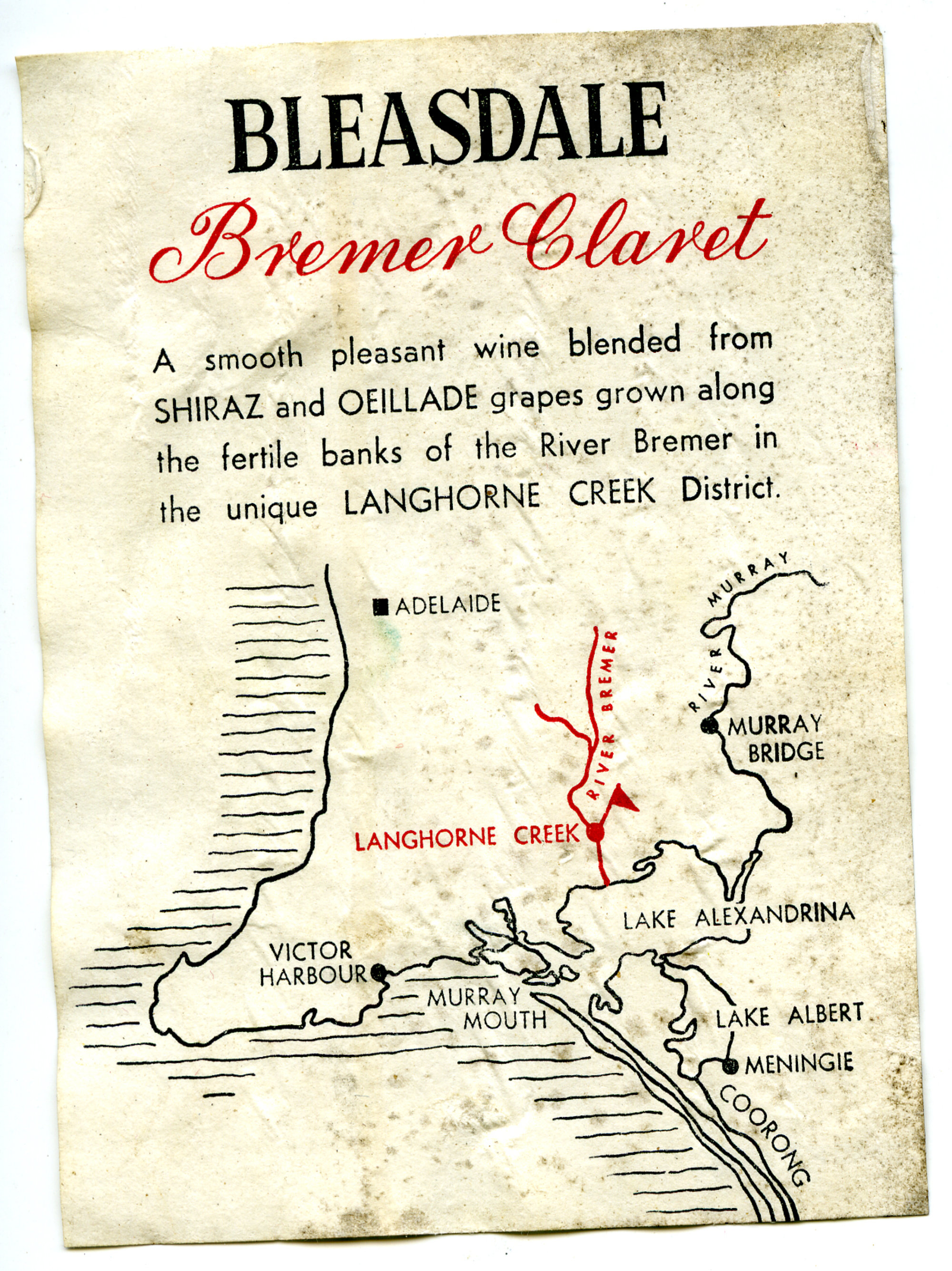 Label reads: "BLEASDALE Bremer Claret A smooth pleasant wine blended from SHIRAZ and OEILLADE grapes grown along the fertile banks of the river Bremer in the unique LANGHORNE CREEK District"
