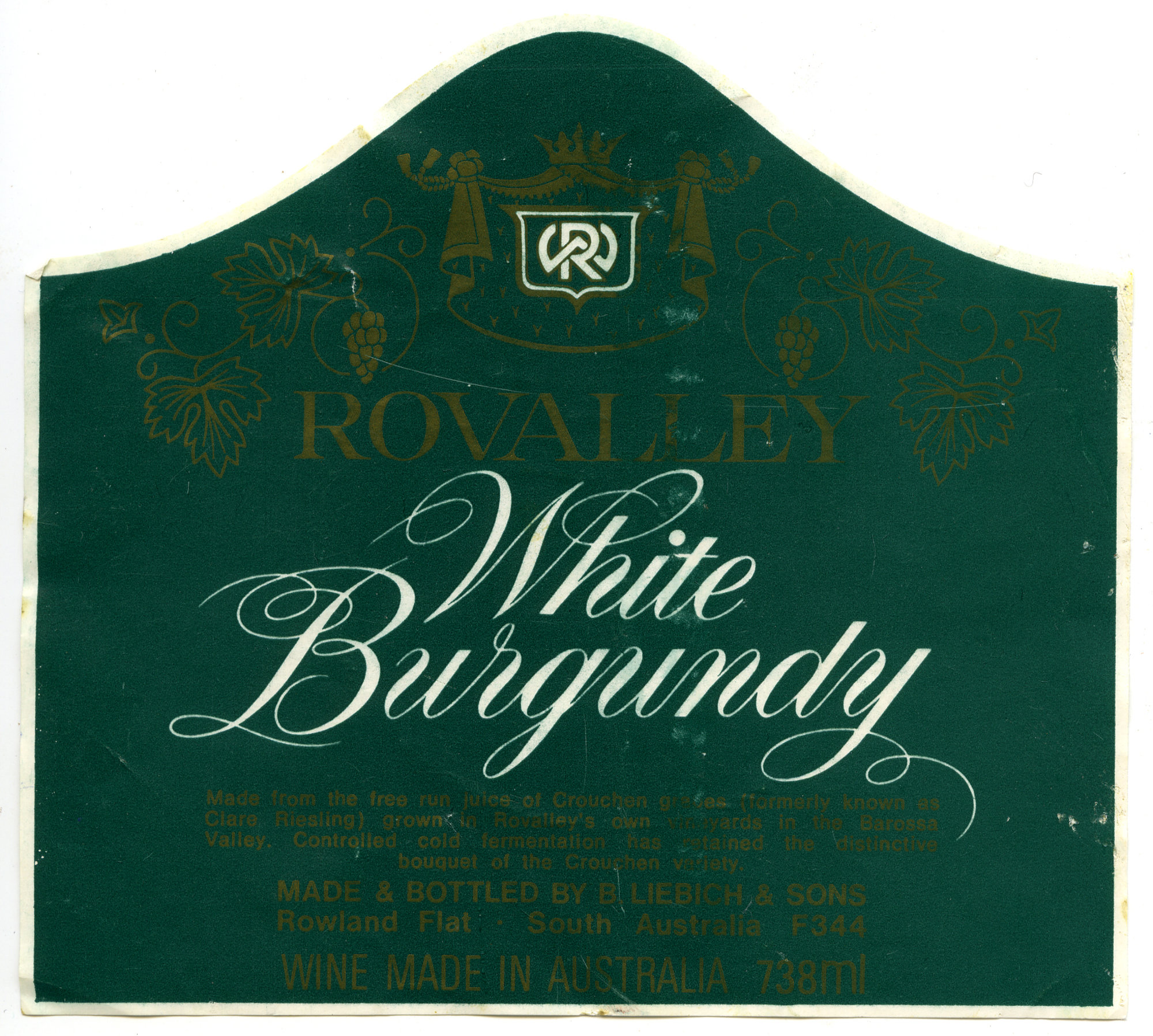 Label reads: "ROVALLEY White Burgundy Made from the free run juice of Grouchen grape (formly known as Clare Riesling) grown in Rovalley's own vineyards in the Barossa Valley. Controlled cold fermentation has retained the distinctive bouquet of the Crouchen Valley Made and Bottled by B Liebich and Sons Rowland Flat South Australia F344 Wine made in Australia 738ml"