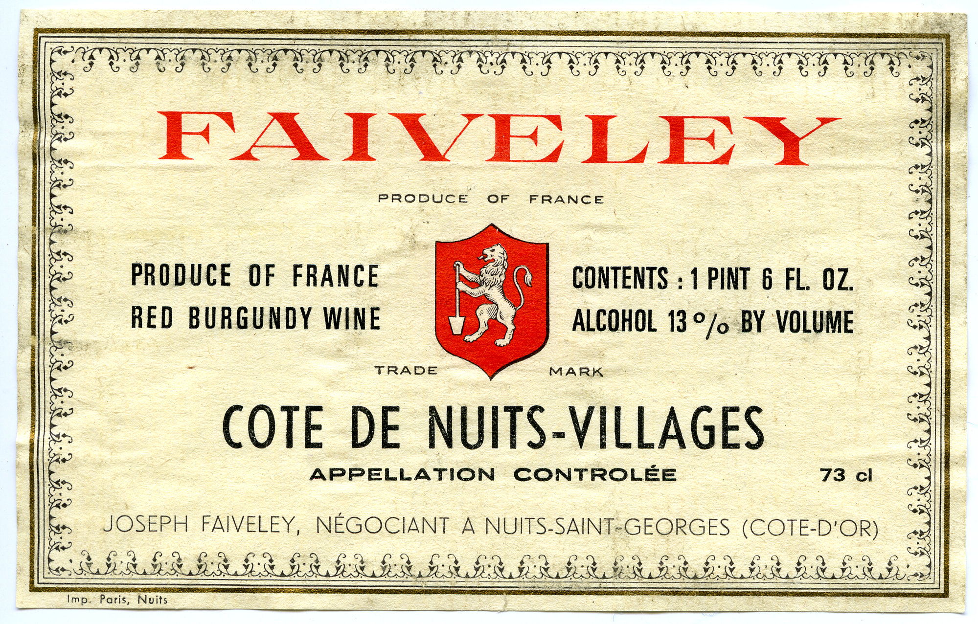 Label reads: "FAIVELEY Produce of France Contents: 1 pint 6 FL OZ Alcohol 13% by Volume COTE DE NUITS-VILLAGES Appellation Controlee Joseph Faaiveley, Negociant a Nuits- Saint - Georges (Cote-D'or) 73 c l"