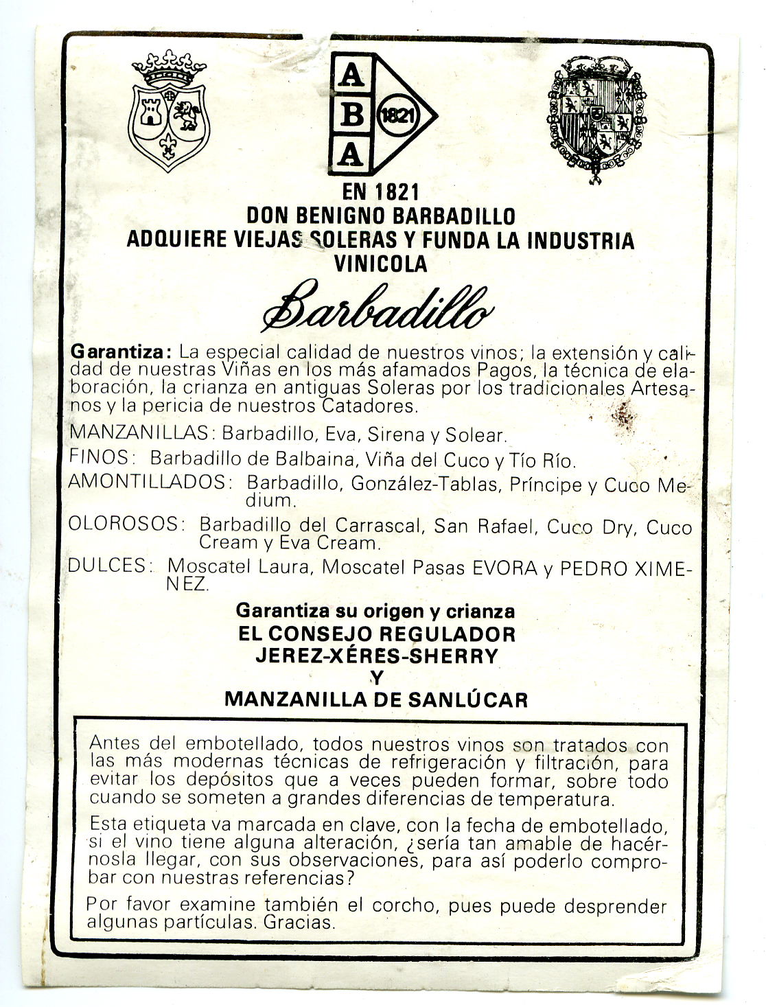 Label reads: "ABA 1821 En 1821 Don Benigno Barbadillo Adquiere Viejas Soleras Y Funda La Industria Vinicola BARBADILLO Garantiza: La especial calidadde nuestros vinos; La extension y calidad de nuestras Vinas en los mas afamados Pagos, la tecnica de elaboracion, la crianza en antigus Soleras por los tradicionalesArtesanos y pericia de nuestros Catadores. MANZANILLAS: Barbadillo, Eva, Sirena y Solear. FINOS: Barbadillo de Balbainna, Vina del Cuco y Tio Rio. AMONTILLADOS: Barbadillo, Gonzalez-Tablas, Principe y Cuco Medium OLOROSOS: Barbadillo del Carrascal, San Rafael, Cuco Dry, Cuco Cream y Eva Cream DULCES: Moscatel Laura, Moscatel Pasas EVORA y PEDRO XIMENEZ. Garantiza su origen y crianza El Consejo Regulador Jerez- Xeres-sherry Y Manzanilla De Sanlucar Antes del embotellado, todos nuestros vinos son tratados con las mas modernas tecnicas de refrigeracion y filtracion, paraevitar los depositos que a veces pueden formar, sobre todo coando se someten a grandes diferencias de temperatura. Esta etiqueta va marcada en clave, con la fecha de embotellado, si el vino tiene alguna alteracion seria tan amable de hacernosla llegar, con sus observaciones, para asi poderlo comprobar con nuestras referencias? Por favor examine tambien el corcho, pues puede desprender algunas particulas. Gracias.