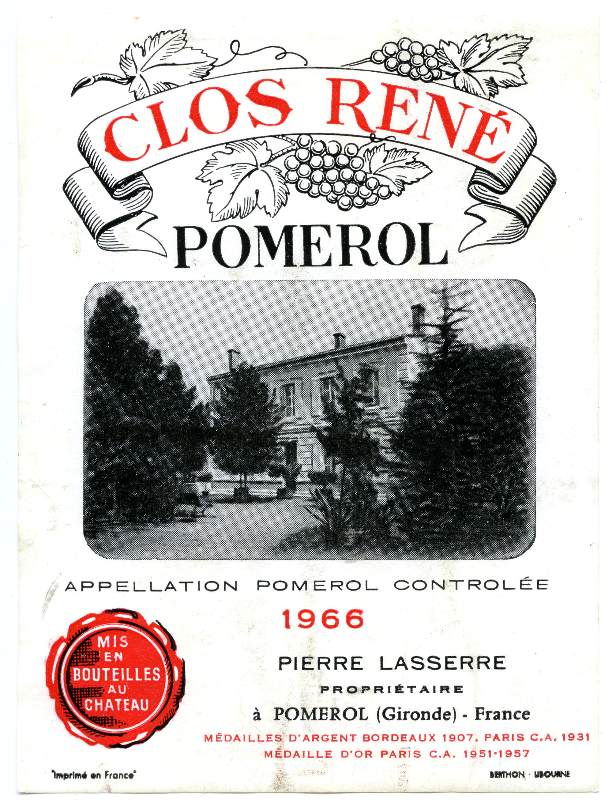 Label reads: "CLOS RENE POMEROL Appellation Pomerol Controlee 1966 Pierre Lasserre Proprietaire a Pomerol (Grande) France Medailles D'Argent Bordeaux 1907 Paris C.A. 1931 Medaille D'or Paris C.A. 1951-1957"