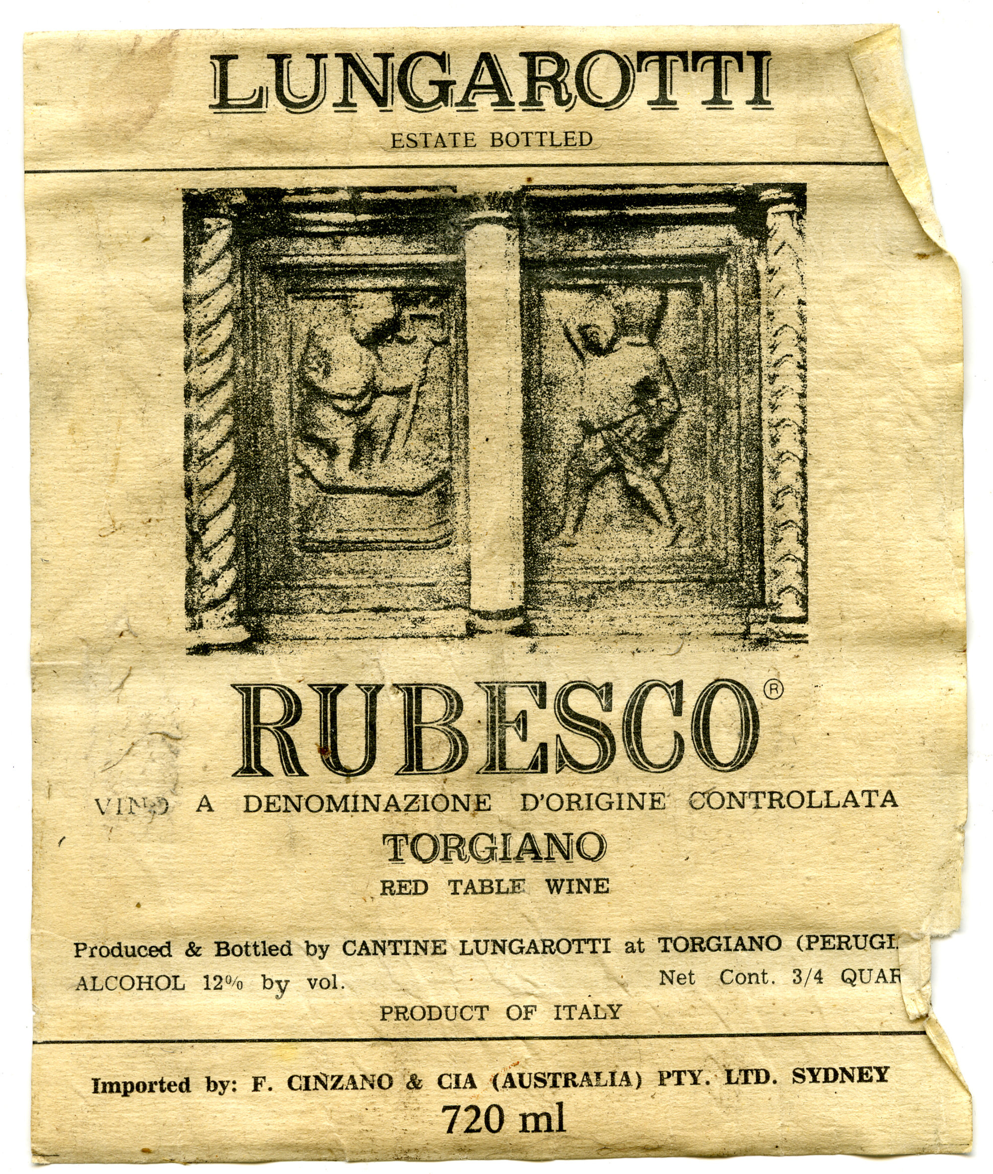 Label reads: "LUNGAROTTI RUBESCO Vino A Denominazione D'origine Controllata Torgiano Red Table Wine Produced and Bottled bu Cantine Lungarotti at Torgiano [Perug......] Alcohol 12% by Vol Net Cont. 3/4 Quarts Product of Italy Imported by: F Cinzano and Cia (Australia) Pty. Ltd. Sydney 720ml"