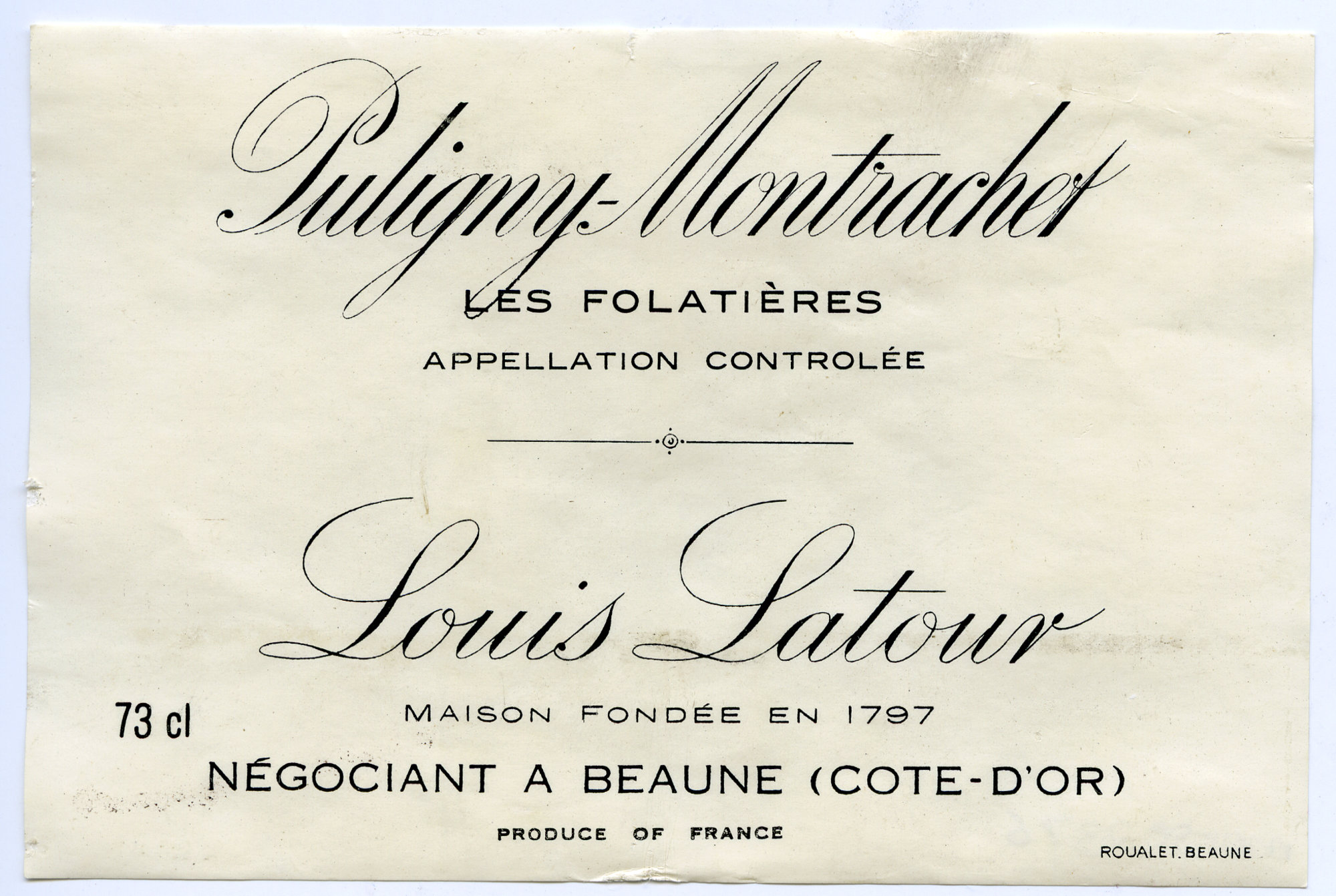 Label reads: " Puligny - Montrachet Les Folatieres Appelltation Controlee Louis Latour Maison Fondee En 1797 73 c l Negociant A Beaune (Cote- D'or) Produce of France"