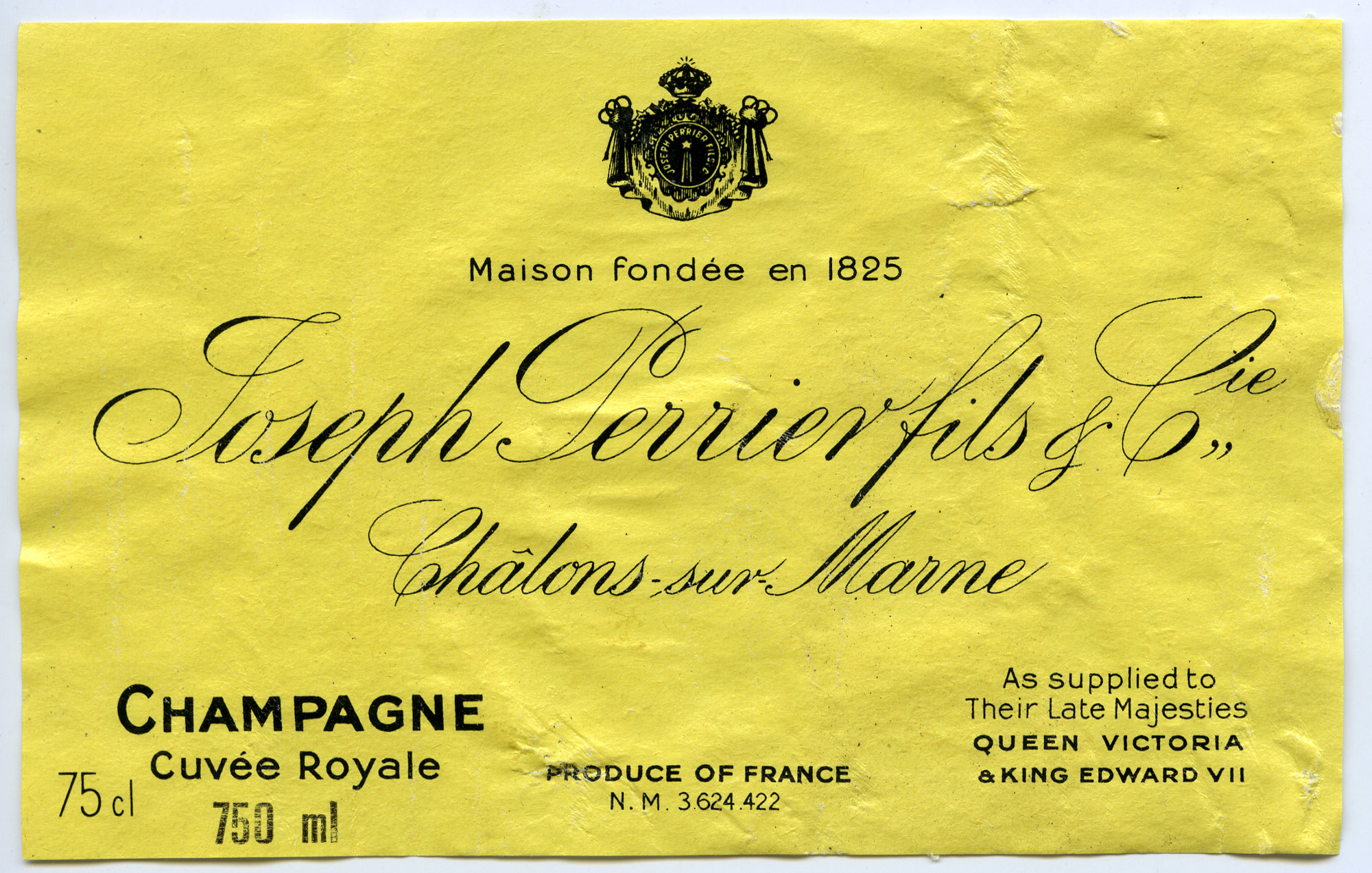 Label reads: "Maison Fondee en 1825. Joseph Perrier Fils and Cie. Chalons-Sur Marne. Champagne cuvee Royale. 75cl. 750ml. Produce of France. N. M. 3624422. As supplied to Their Late Majesties Queen Victoria and King Edward VII."
