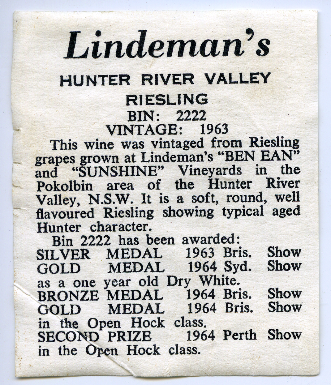 Lindeman's Hunter River Valley Riesling Label (1963) (1963). Living Histories, accessed 16/02/2026, https://livinghistories.newcastle.edu.au/nodes/view/62673