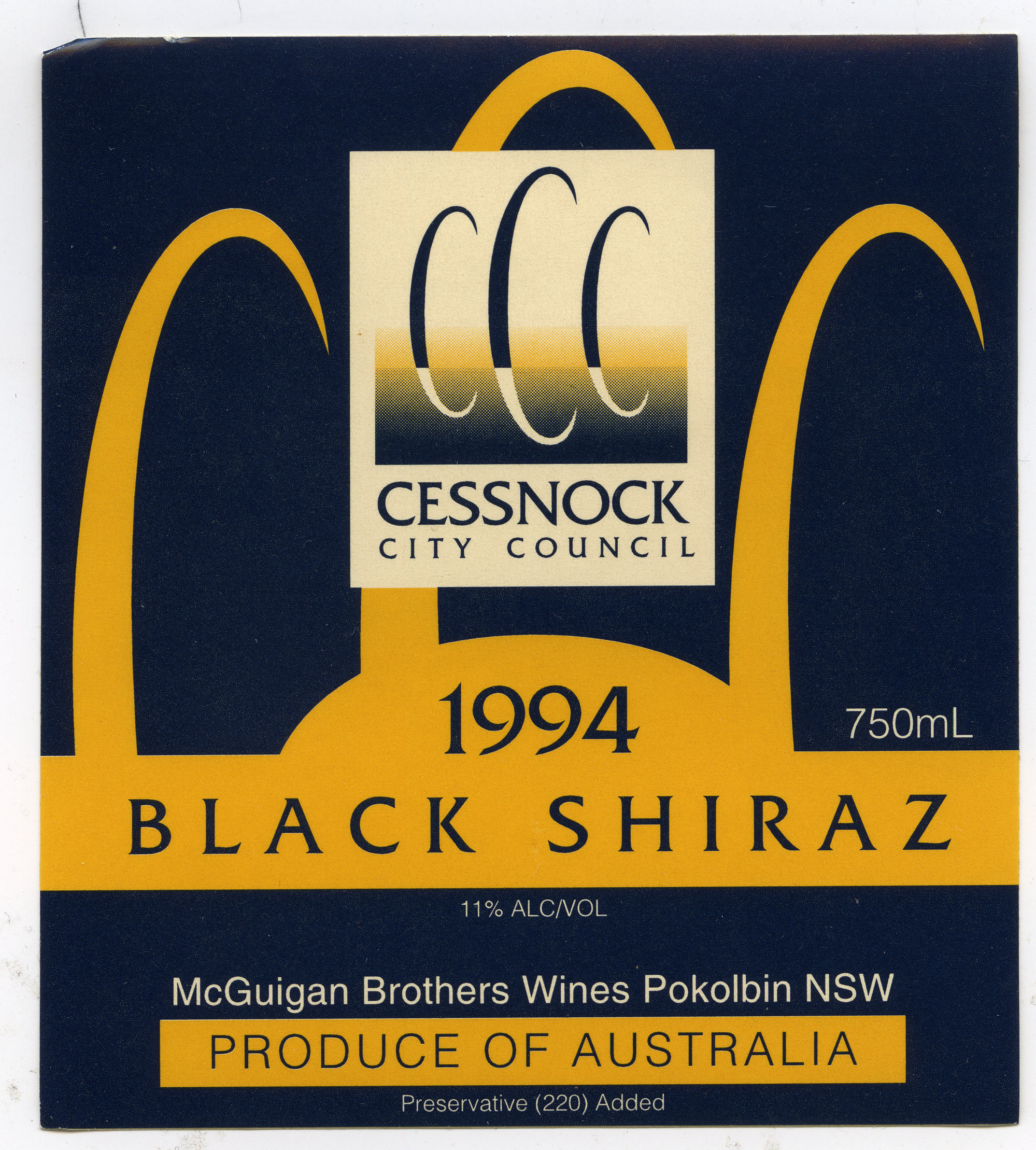 Label reads: "Cessnock City Council. 1994. 750ml. Black Shiraz. 11% ALC/VOL. McGuigan Brothers Wines Pokolbin NSW. Produce of Australia. Preservative (200) Added."