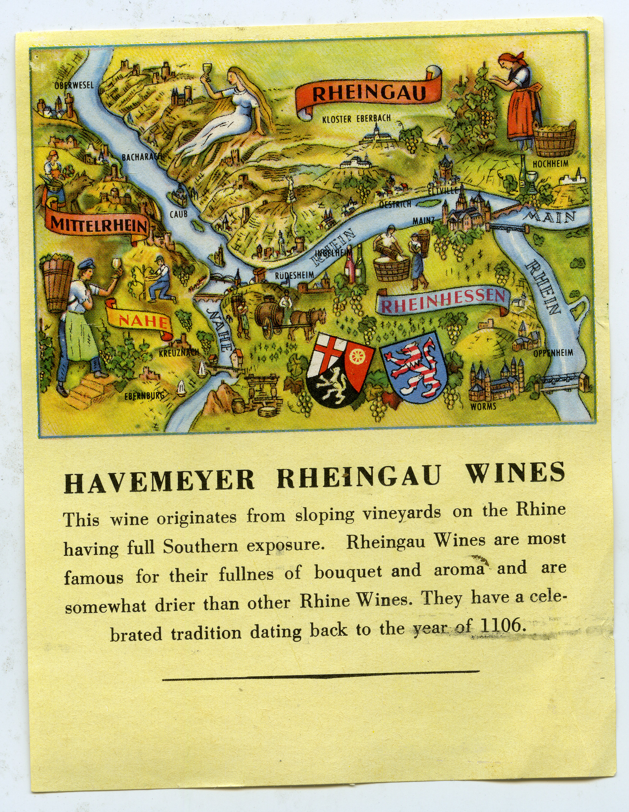 Label reads: "Havemeyer Rheingau Wines. This wine originates from the sloping vineyards on the Rhine having full Southern exposure. Rheingau Wines are most famous for their fullness of bouquet and aroma and are somewhat drier than other Rhine Wines. They have a celebrated tradition dating back to the year of 1106."