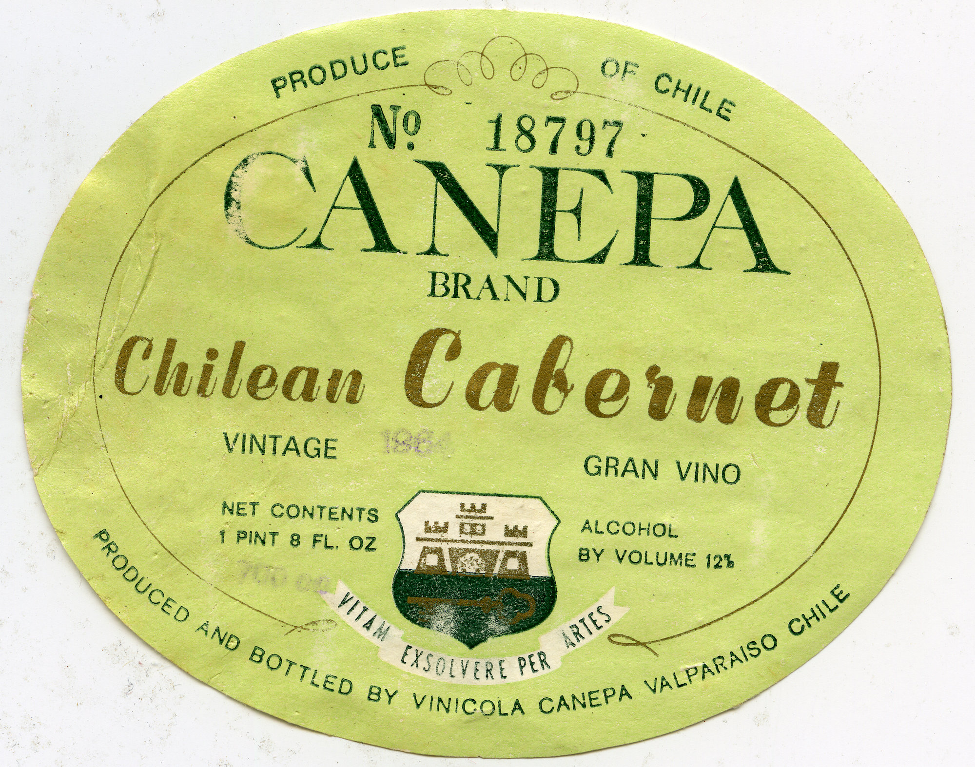 Label reads: "Produce of Chile. No. 18797. Canepa Brand. Chilean Cabernet. Vintage 1864 Gran Vino. Net contents 1 pint 8 fl. oz. Alcohol by volume 12%. Vitam exsolvere per artes. Produced and bottled by Vinicola Canepa Valparaiso Chile."