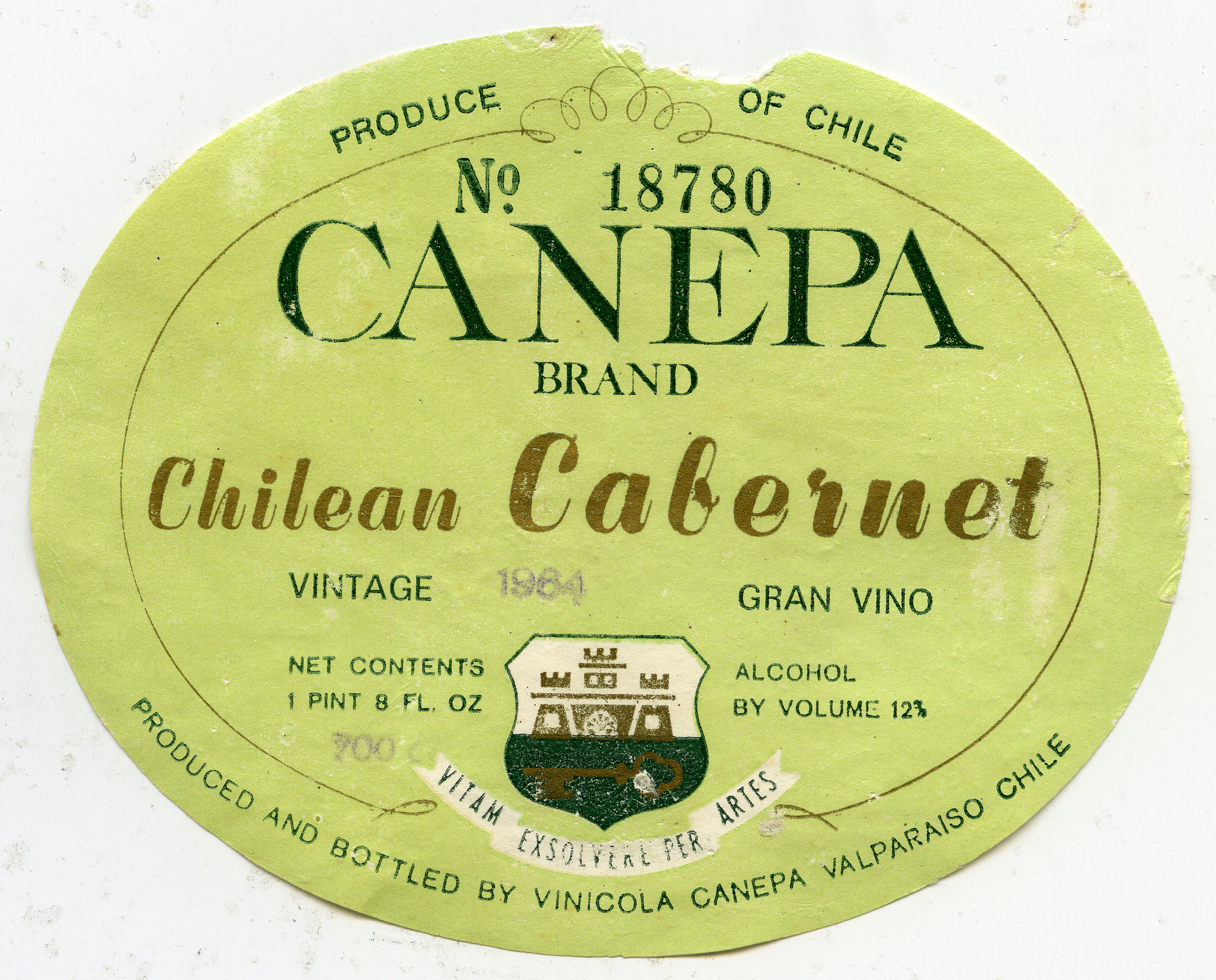 Label reads: "Produce of Chile. No. 18780. Canepa Brand. Chilean Cabernet. Vintage 1864 Gran Vino. Net contents 1 pint 8 fl. oz. Alcohol by volume 12%. Vitam exsolvere per artes. Produced and bottled by Vinicola Canepa Valparaiso Chile."