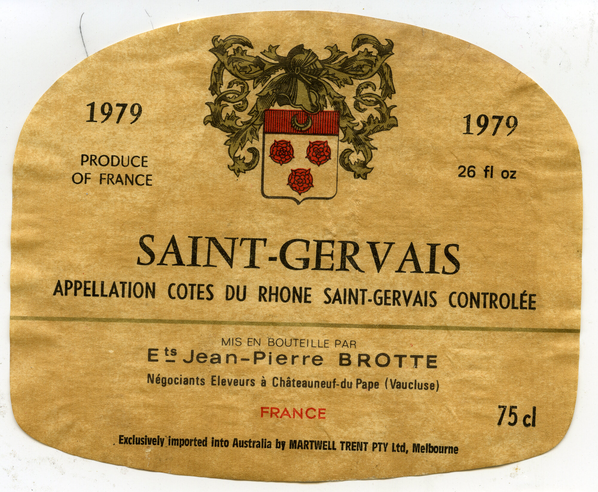 Label reads: "1979. Produce of France. 26 fl oz. Saint-Gervais. Appellation cotes du rhone saint-gervais controlee. Mis en bouteille par. Ets Jean-Pierre Brotte. Negociants Eleveurs a chateauneuf-du Pape (Vaucluse). France. 75cl. Exclusively imported into Australia by Martwell Trent Pty Ltd, Melbourne."