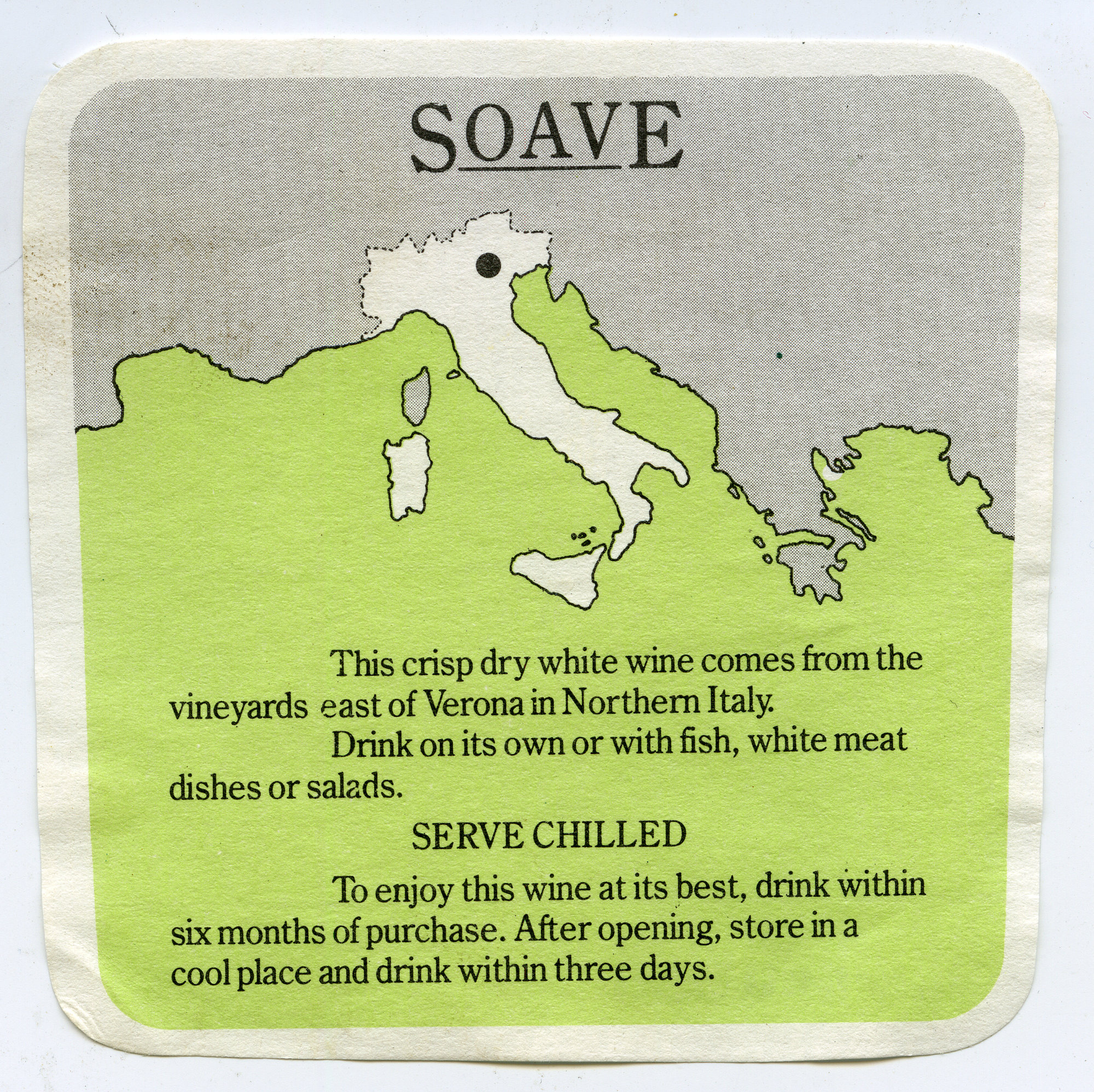 Label reads: "Soave. This crisp dry white wine comes from the vineyards east of Verona in Northern Italy. Drink on its own or with fish, white meat dishes or salads. Serve chilled. To enjoy this wine at its best, drink within six months of purchase. After opening, store in a cool place drink within three days."