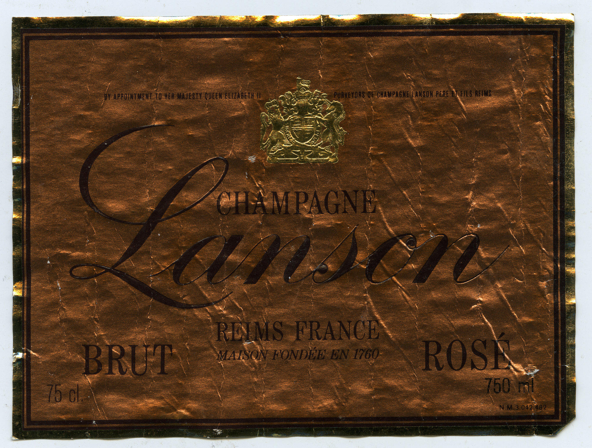 Wine MakerHerve DantanWineryChampagne LansonCollectorMorse, AllanType of WineChampagneLanguageFrenchDescriptionLabel reads: "Champagne Lanson. Reims France Maison Fondee en 1760. Brut Rose. 75cl. 750ml. N.M. 3047482."