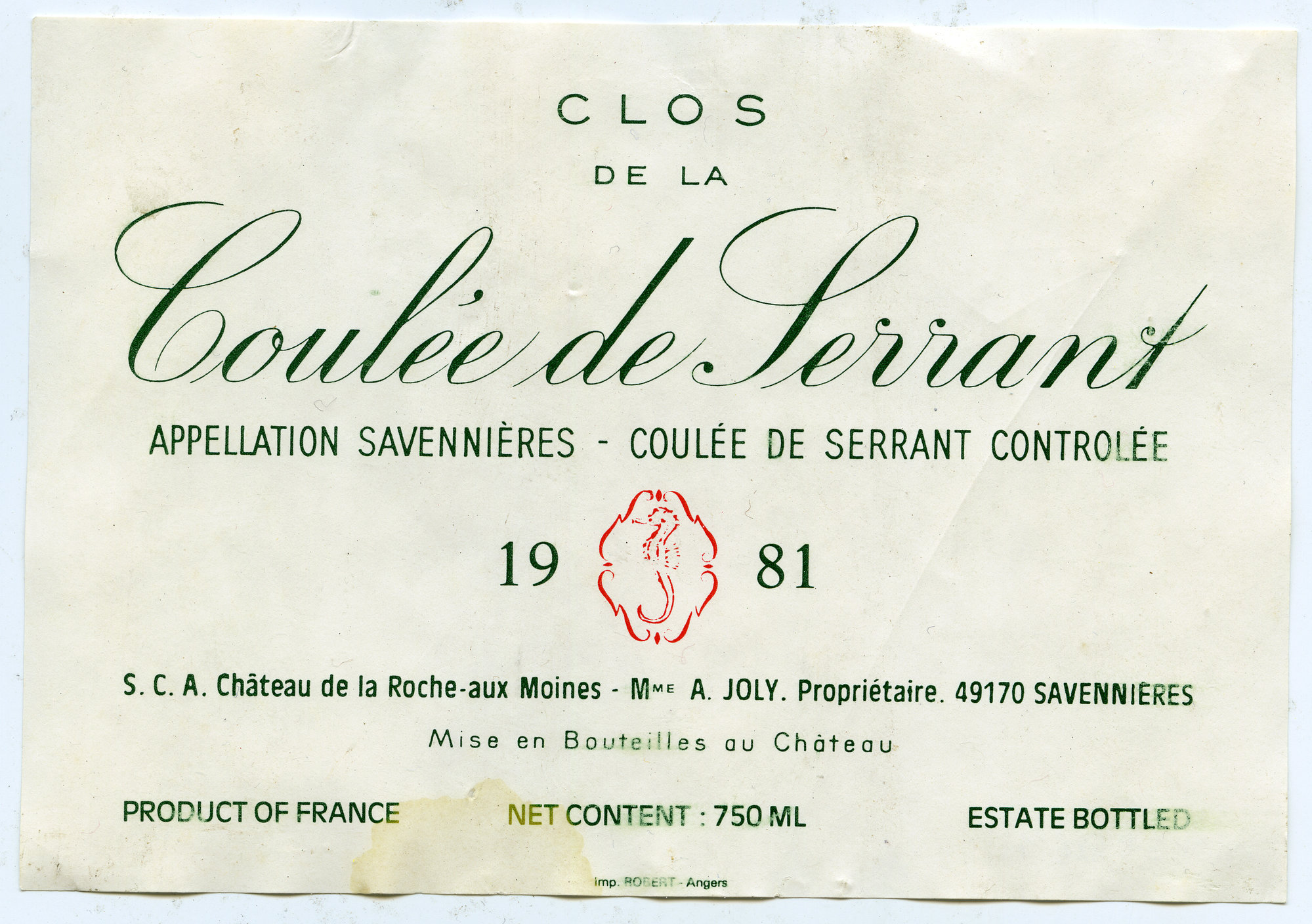 Label reads: "Clos de la. Coulee de Serrant. Appellation savennieres - coulee de serrant controlee. 1981. S. C. A. Chateau de la Roche-aux Moines - Mme A. Joly. Proprietaire. 49170 Savennieres. Mise en bouteilles au chateau. Product of France. Net content : 750ml. Estate bottled."