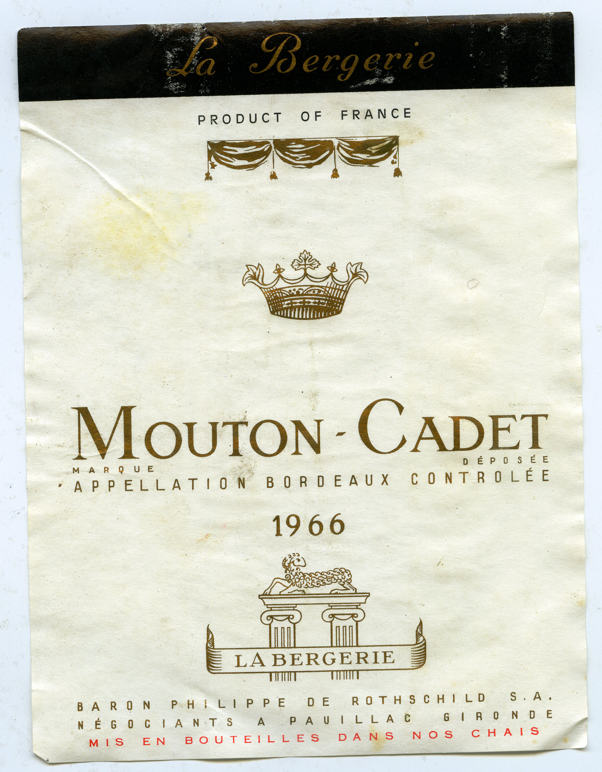 Label reads: "La Bergerie. Product of France. Mouton-Cadet. Marque deposee. Appellation bordeaux controlee. 1966. La Bergerie. Baron Philippe de Rothschild S.A. Negociants a pauillac gironde. Mis en bouteilles dans nos chais."