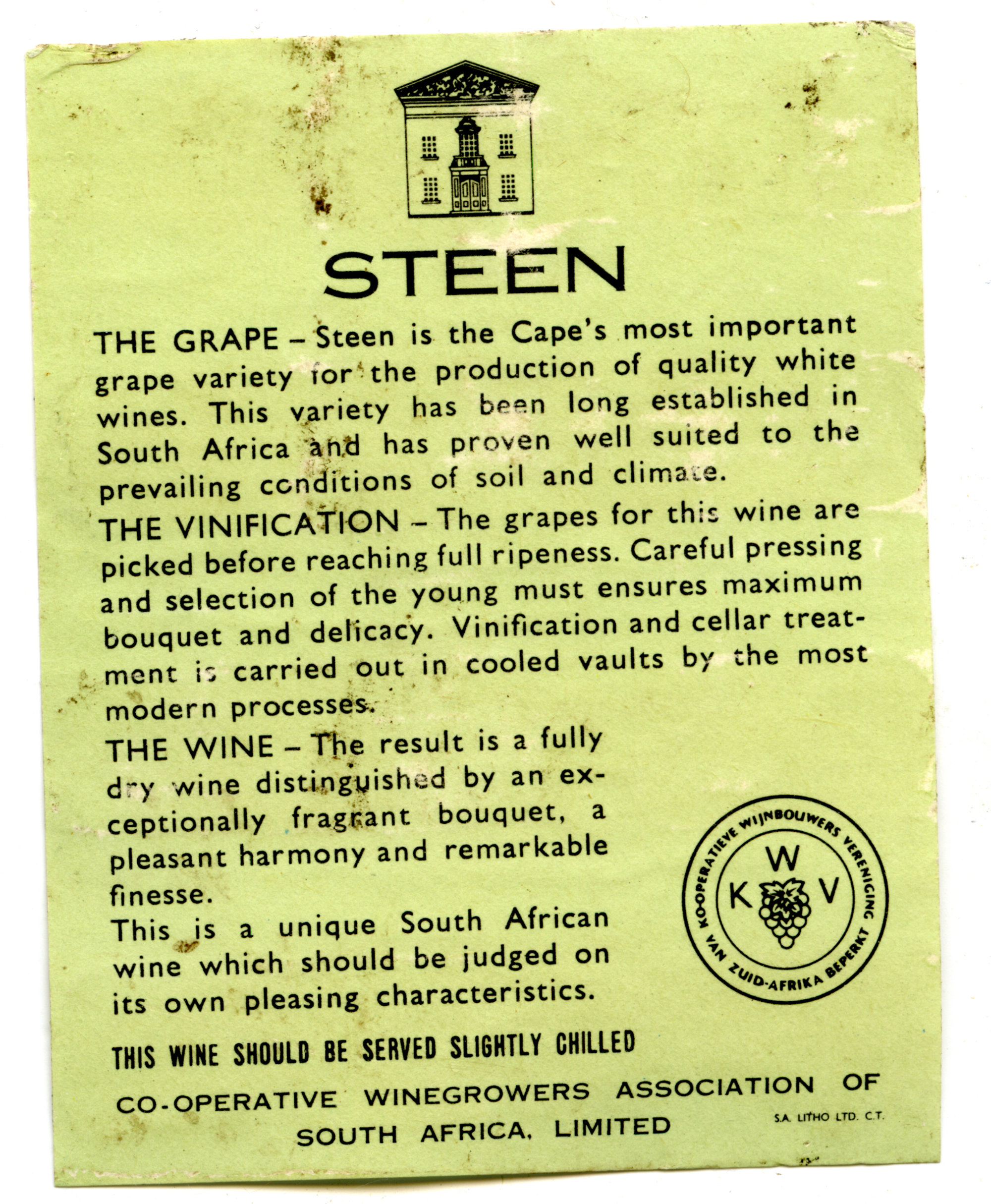 Co-Operative Winegrowers Association of South Africa Steen Label [n.d.]