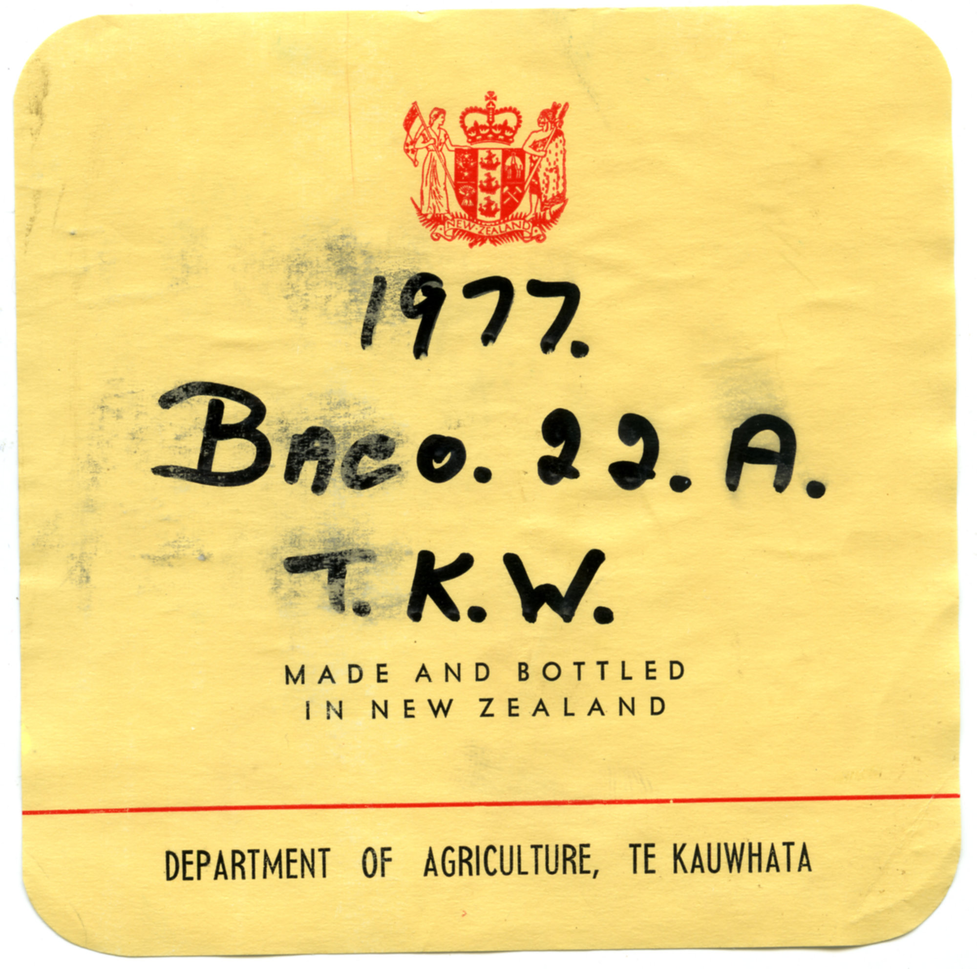 Label reads: "1977. Baco. 22. A. T. K. W. Made and bottled in New Zealand. Department of Agriculture, Te Kauwhata."