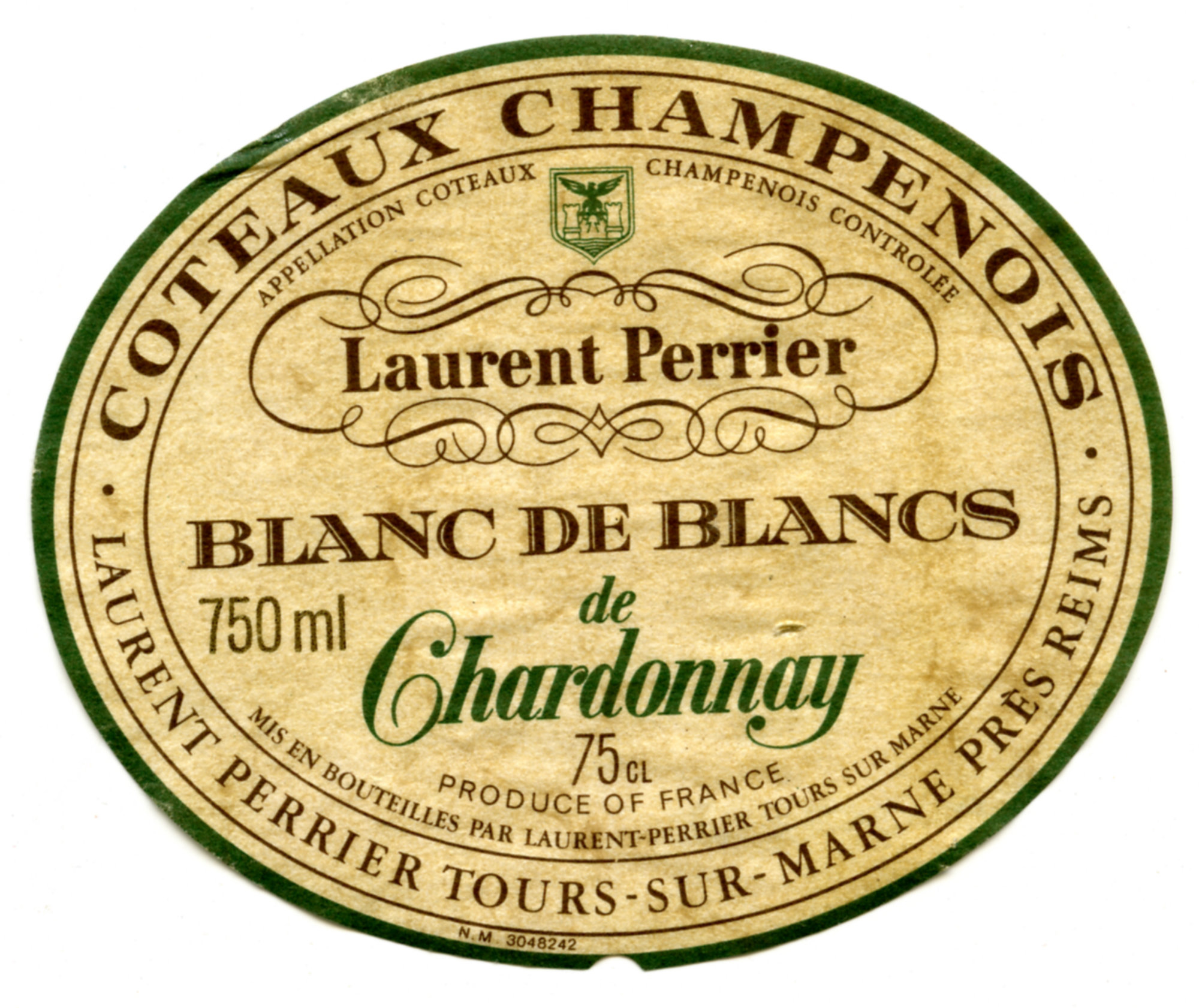 Label reads: "Coteaux champenois. Appellation coteaux champenois controlee. Laurent Perrier. Blanc de blancs. 750ml. de Chardonnay. 75cl. Produce of France. Mis en bouteilles par laurent-perrier tours sur marne. Laurent perrier tours-sur-marne pres reims. N.M 3048242."