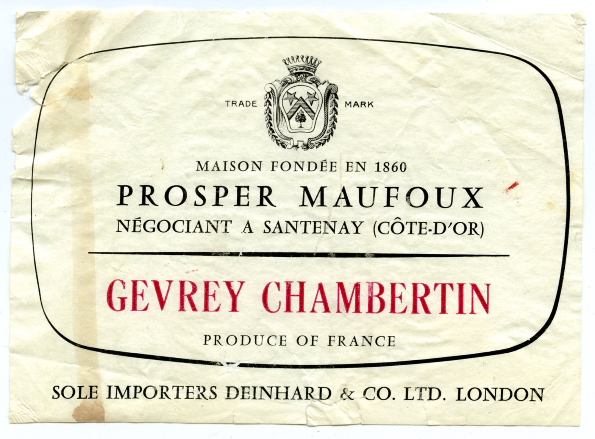 Label reads: "Trade mark. Maison fondee en 1869. Prosper Maufoux negociant a santenay (cote-d'or).Gevrey Chambertin. Produce of France. Sole Importers Deinhard and Co. Ltd. London."