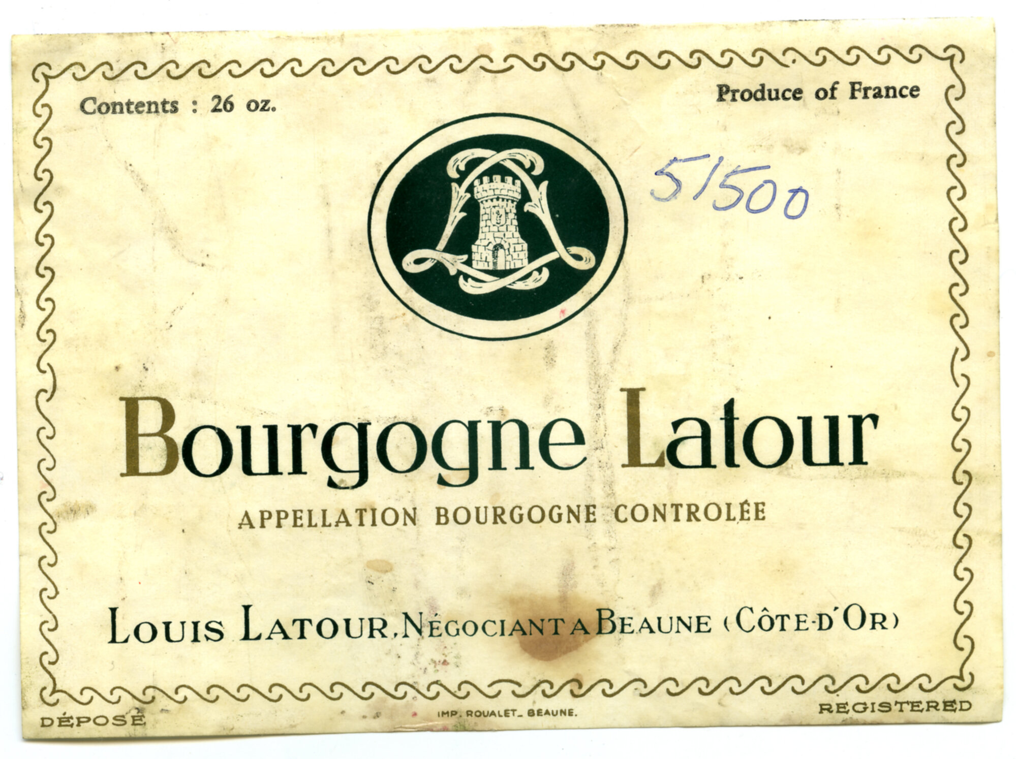 Label reads: "Contents : 26 oz. Produce of France. Bourgogne Latour. Appellation bourgogne controlee. Louis Latour, negociant a beaune (cote-d'or). Depose. IMP. Roualet_Beaune. Registered."