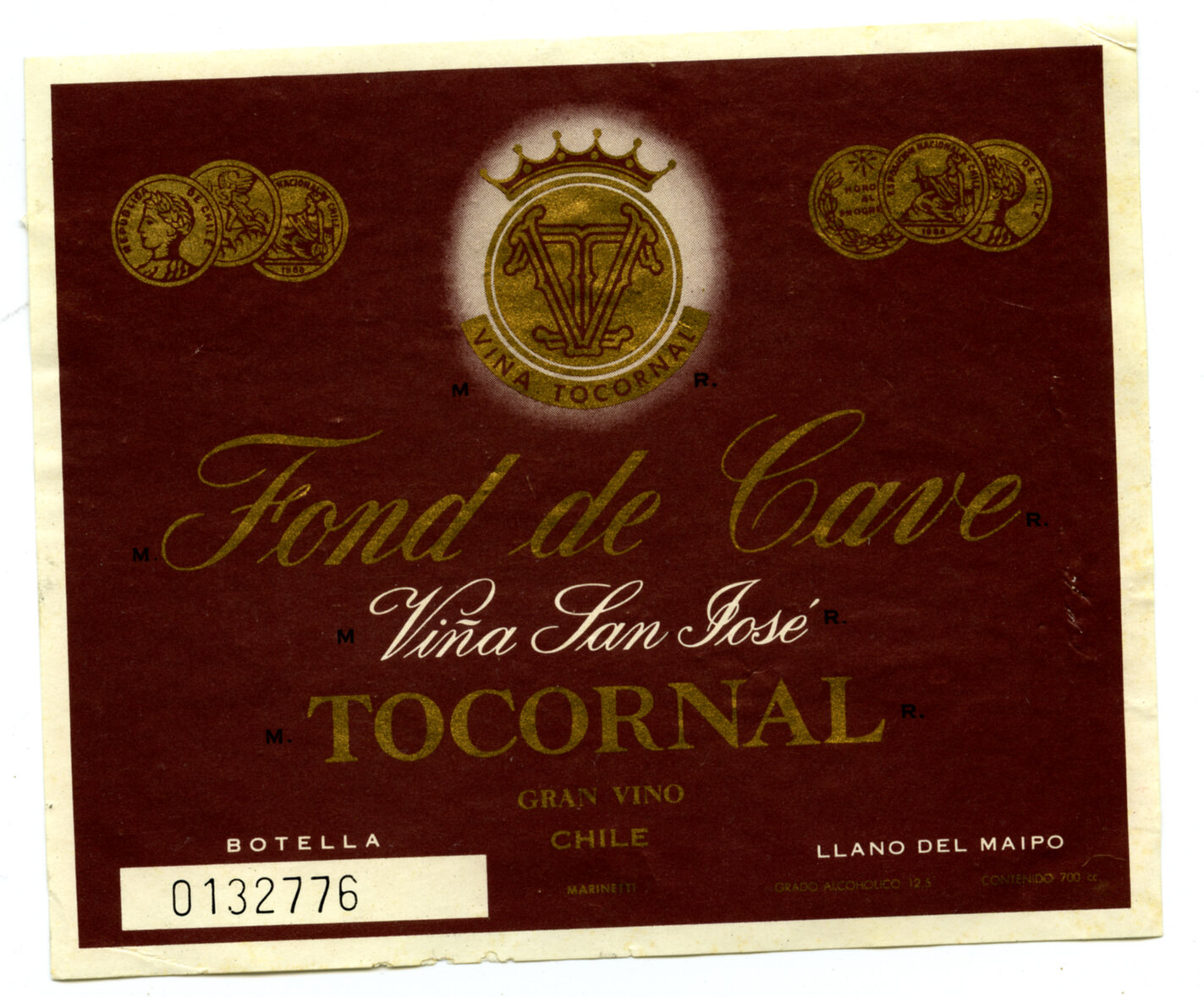 Label reads: "Vina Tocornal. Fond de Cave. Vins San Jose. Tocornal. Gran Vino Chile. Botella 0132776. Llana del maipo..."