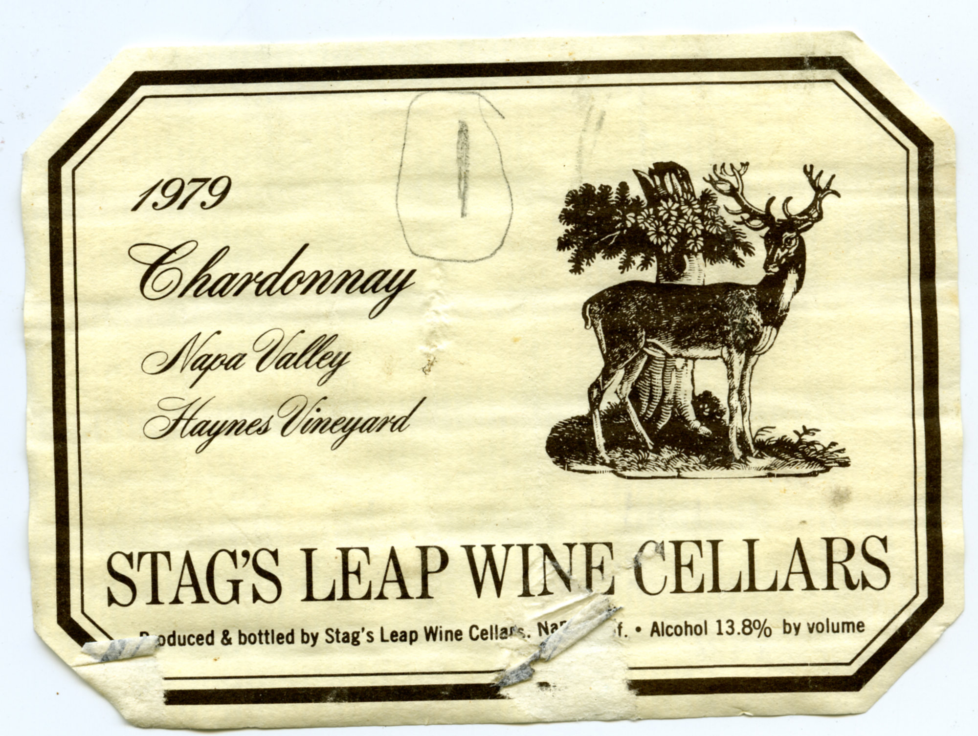 Label reads: "1979. Chardonnay. Napa Valley. Haynes Vineyard. Stag's Leap Wine Cellars. Produced and bottled by Stag's Leap Wine Cellars...Alcohol 13.8% by volume."