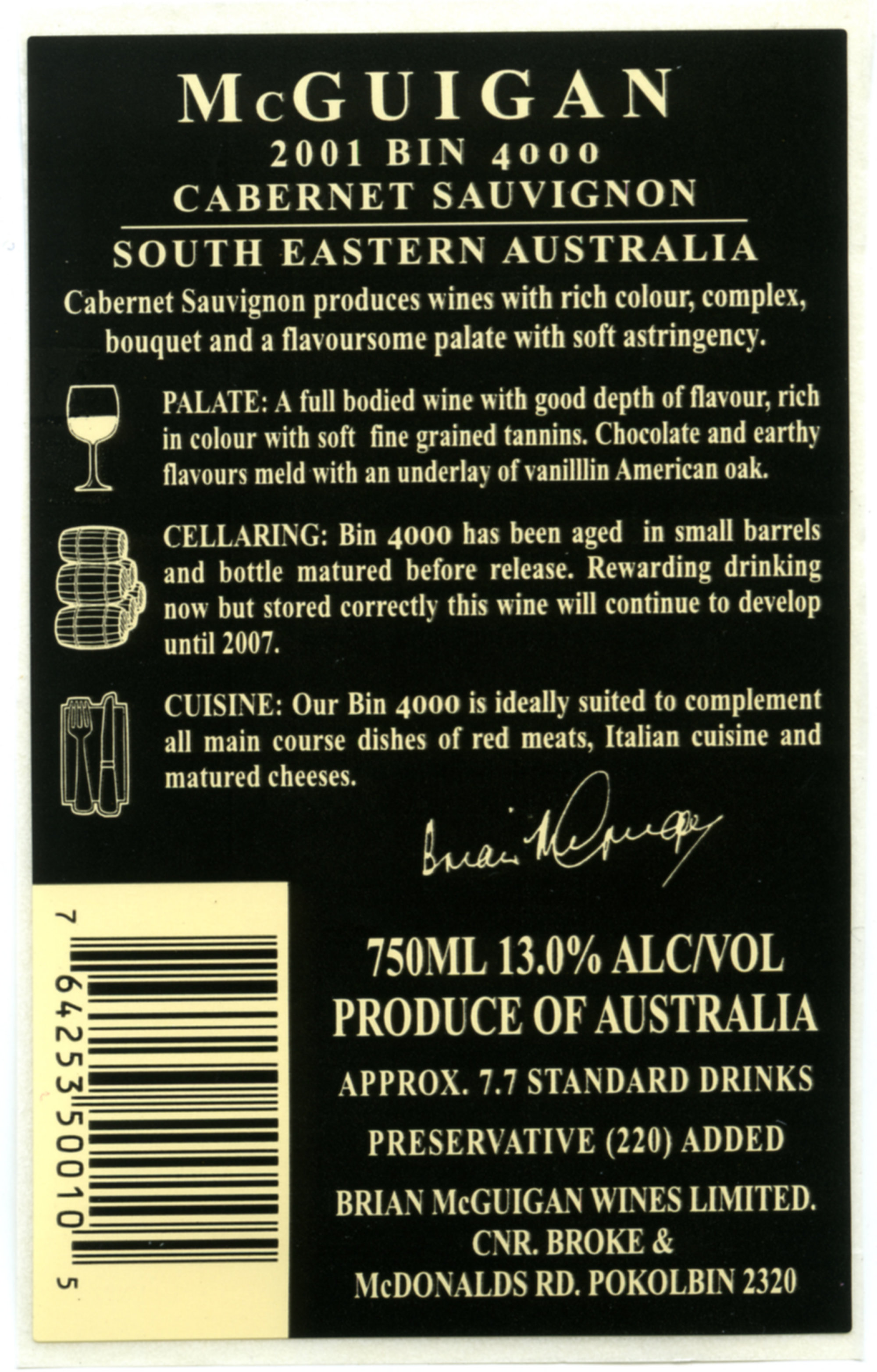 McGuigan Cabernet Sauvignon Label (2001) (2001). Living Histories, accessed 15/01/2026, https://livinghistories.newcastle.edu.au/nodes/view/63124