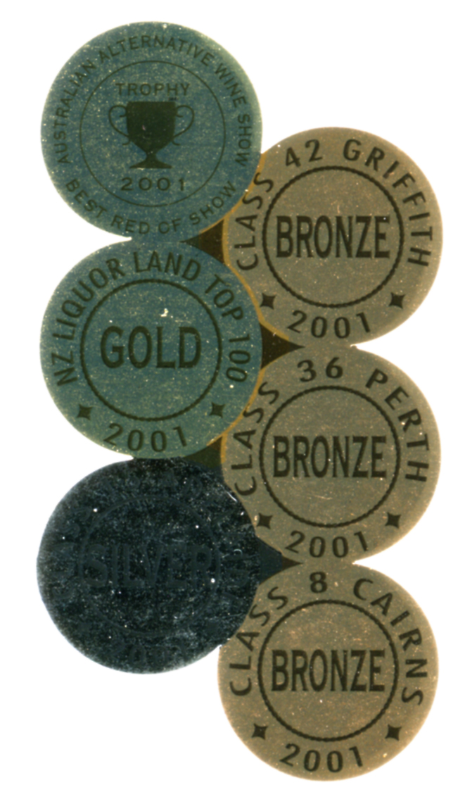 Label reads: "Australian alternative wine show. Best red of show 2001. Bronze Class 42 Griffith 2001. NZ Liquor land top 100 gold 2001. Class 36 Perth bronze 2001. Class 8 Cairns bronze 2001."