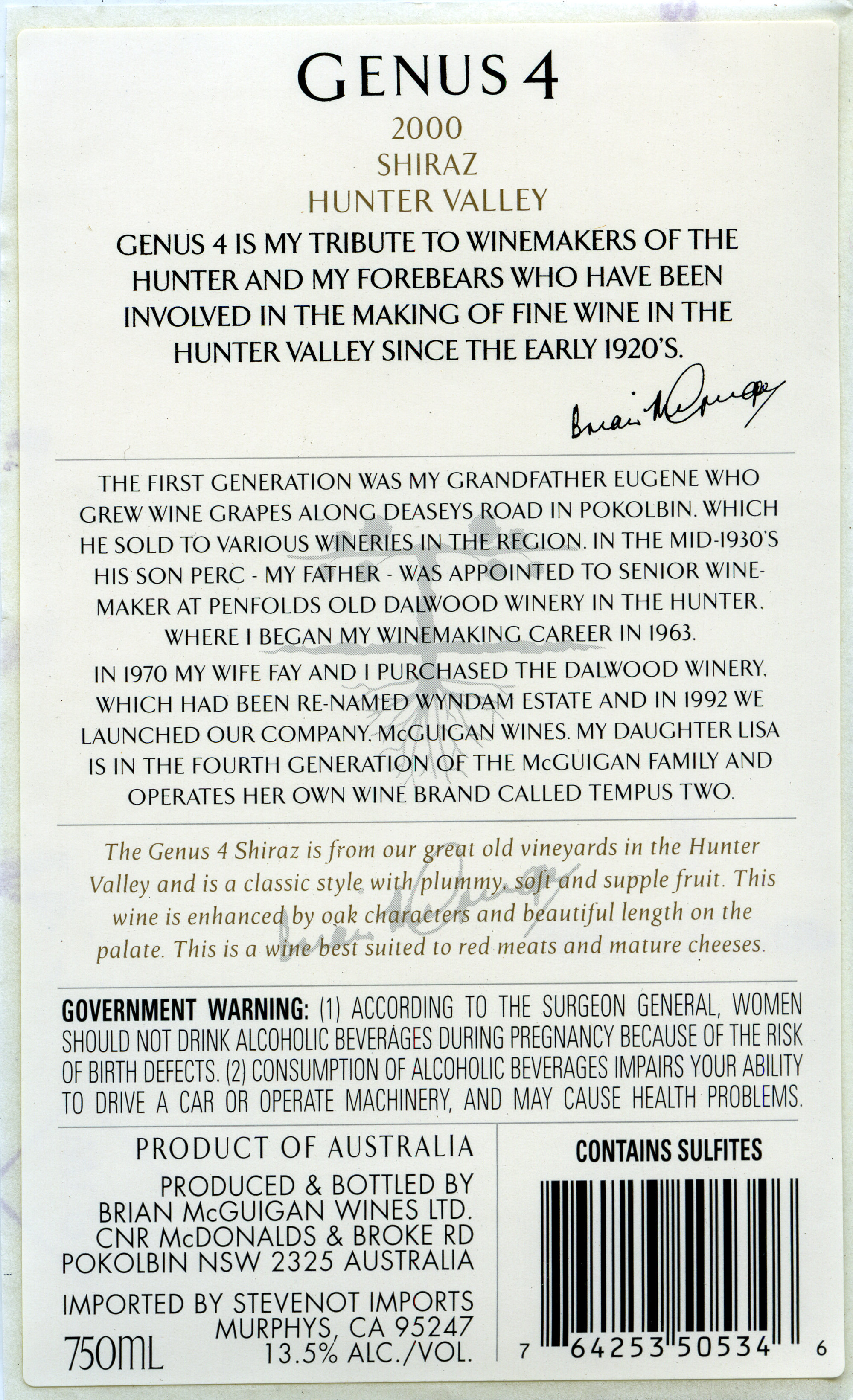 Label reads: "Genus 4. 2000. Chardonnay Hunter Valley. Genus 4 is my tribute to winemakers of the Hunter and my forebears who have been involved in the making of fine wine in the Hunter Valley since the early 1920's...."