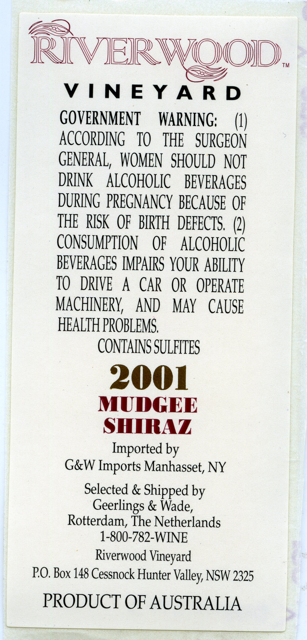 Label reads: "Riverwood vineyard. Government warning: (1) according to the surgeon general, women should not drink alcoholic beverages during pregnancy because of the risk of birth defects. (2) cosumption of alcoholic beverages impairs your ability to drive a car or operate machinary, and may cause health problems. Contains Sulfites. 2001 Mudgee Shiraz...."