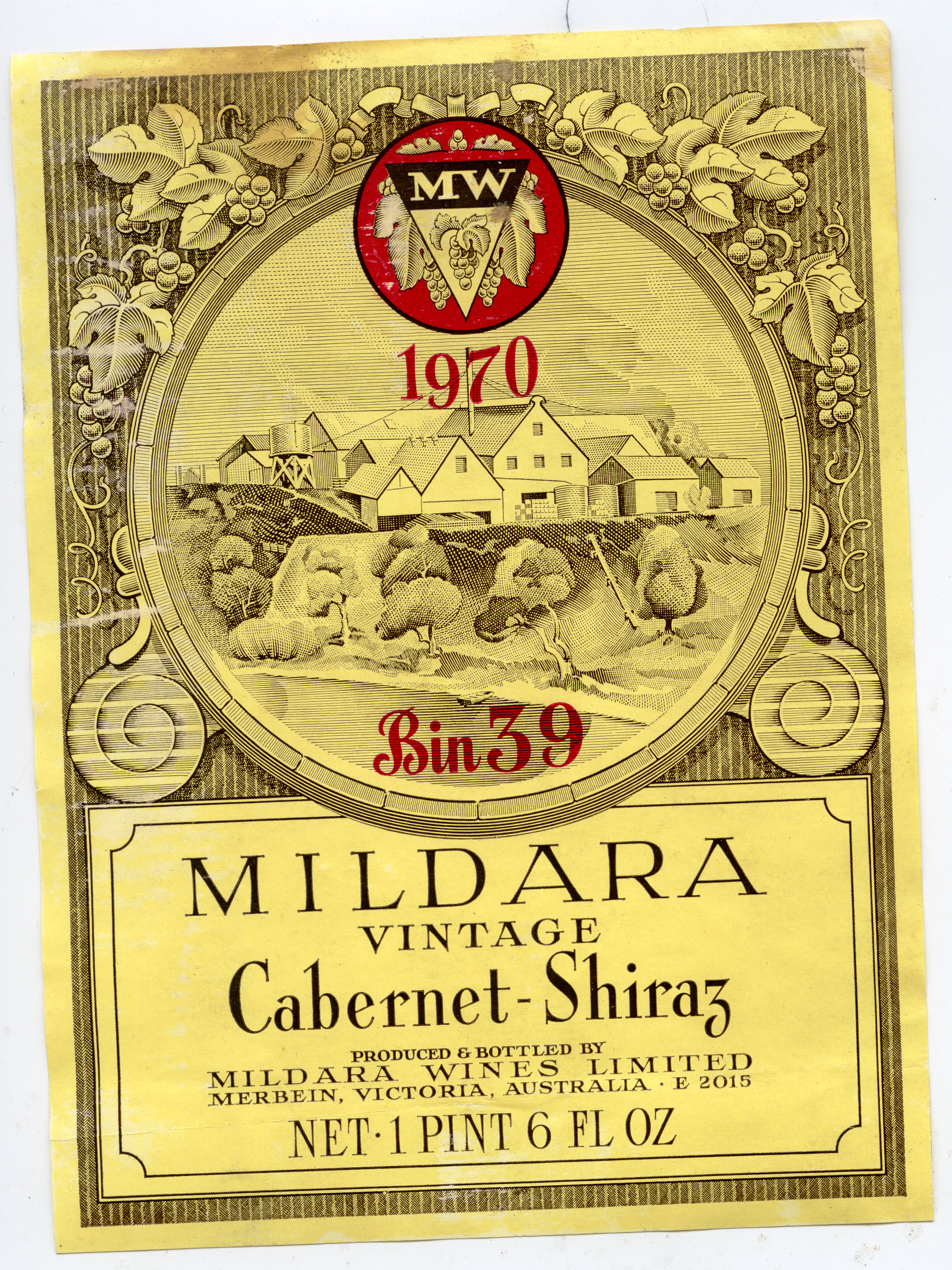 Label reads: "MW 1970. Bin 39. Mildara vintage. Cabernet-Shiraz. Produced and bottled by Mildara Wines Limited. Merbein Australia Victoria. Net-1 pint 6 fl. ozs."