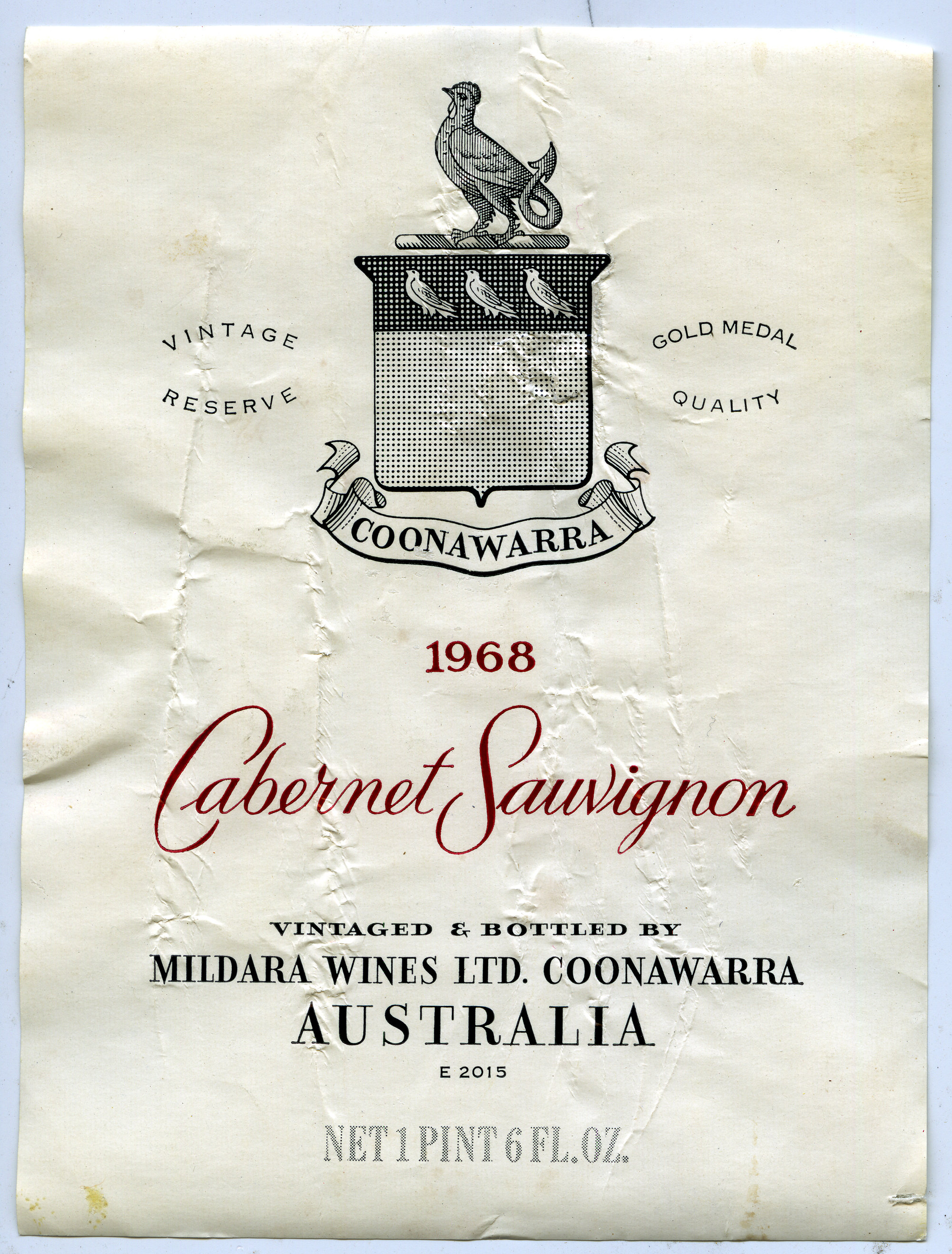 Mildara Cabernet Sauvignon Label (1968) (1968). Living Histories, accessed 18/03/2026, https://livinghistories.newcastle.edu.au/nodes/view/63401