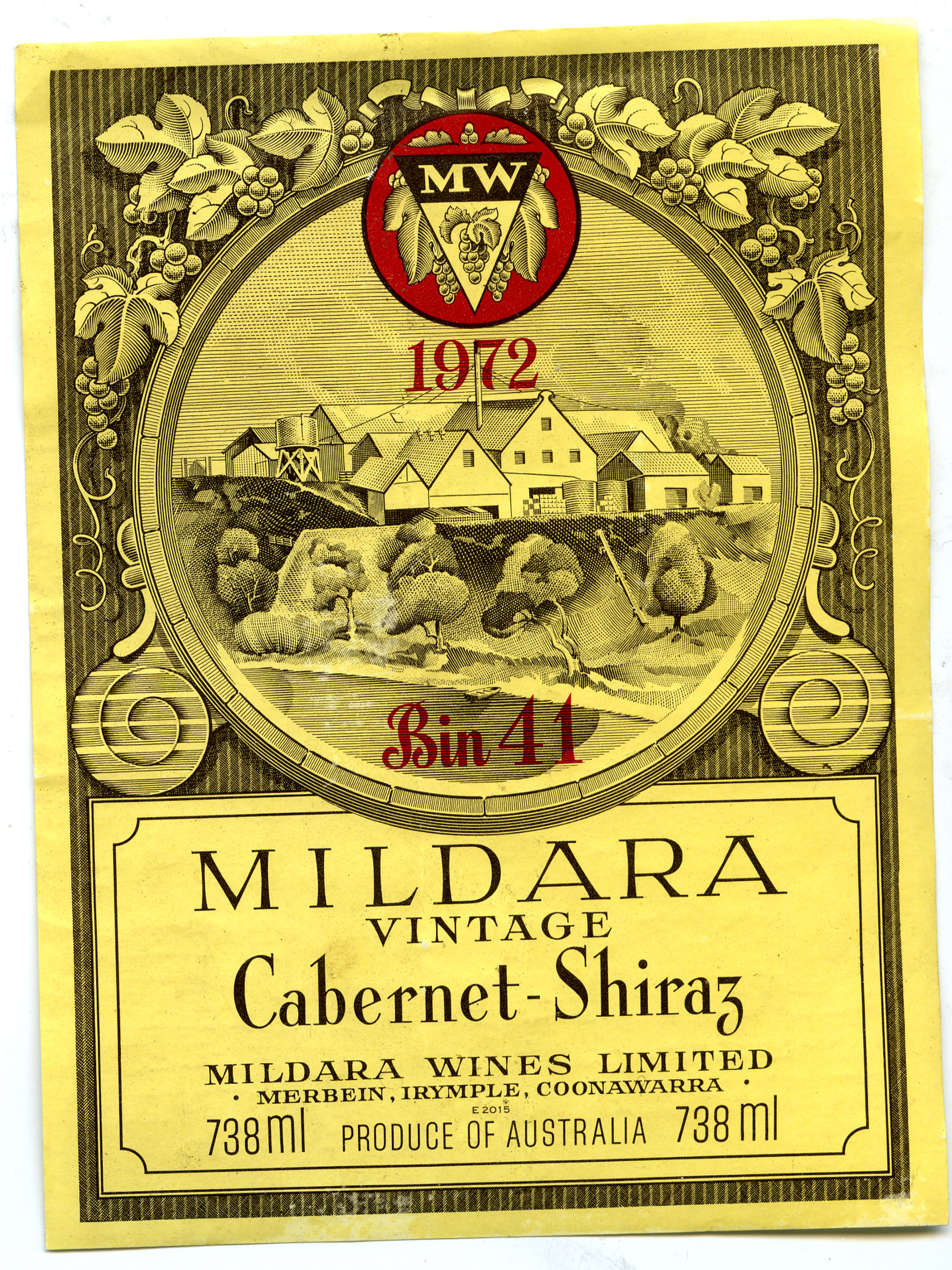 Label reads: "MW 1972. Bin 41. Mildara vintage. Cabernet-Shiraz.Mildara Wines Limited. Merbein, Irymple, Coonawarra. E2015. 738ml. Produce of Australia.738ml."