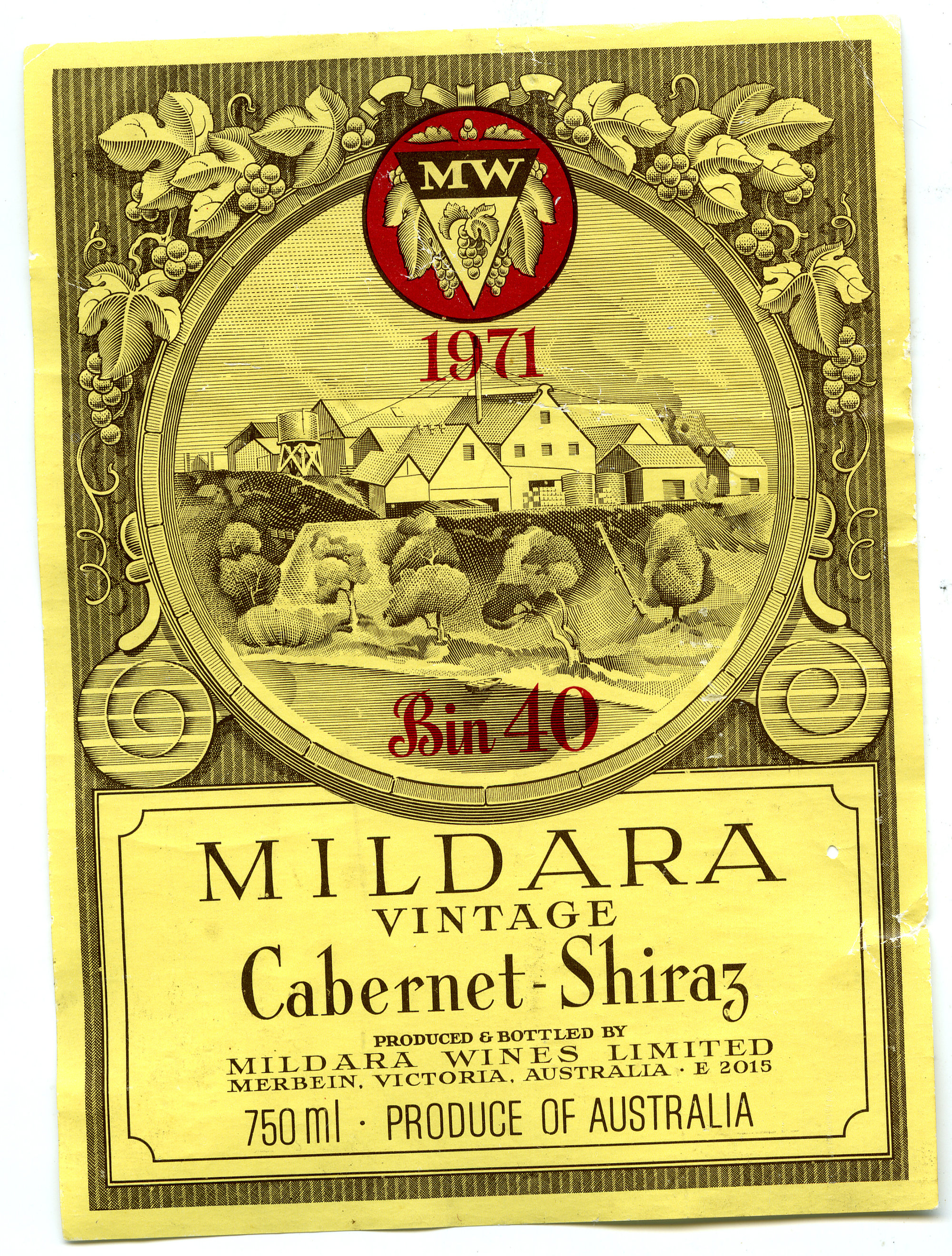 Label reads: "MW 1967. Bin 36. Mildara vintage. Cabernet-Shiraz. Produced and bottled by Mildara Wines Limited. Merbein Victoria Australia. E2015. 750ml. Produce of Australia."