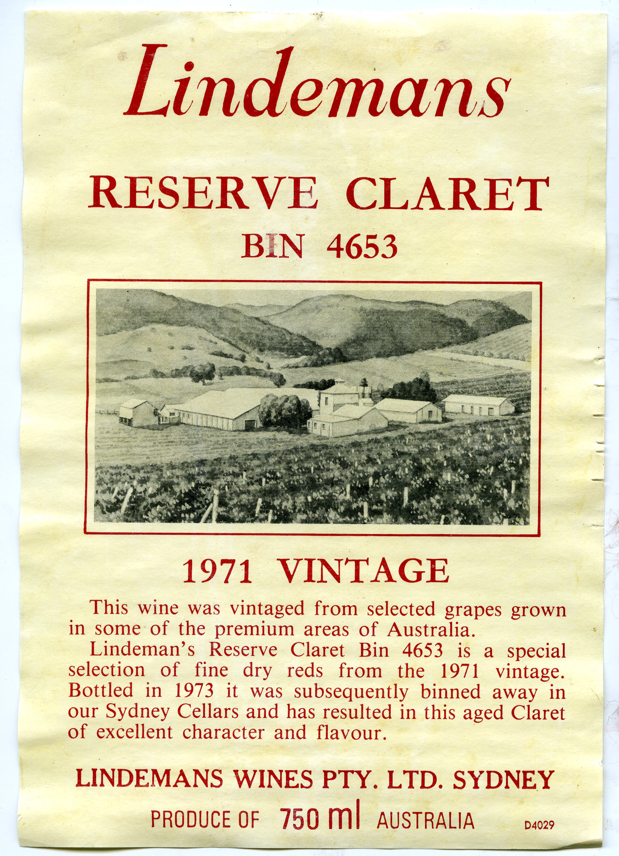 Label reads: "Lindemans. Reserve Claret. Bin 4653. 1971 vintage...."