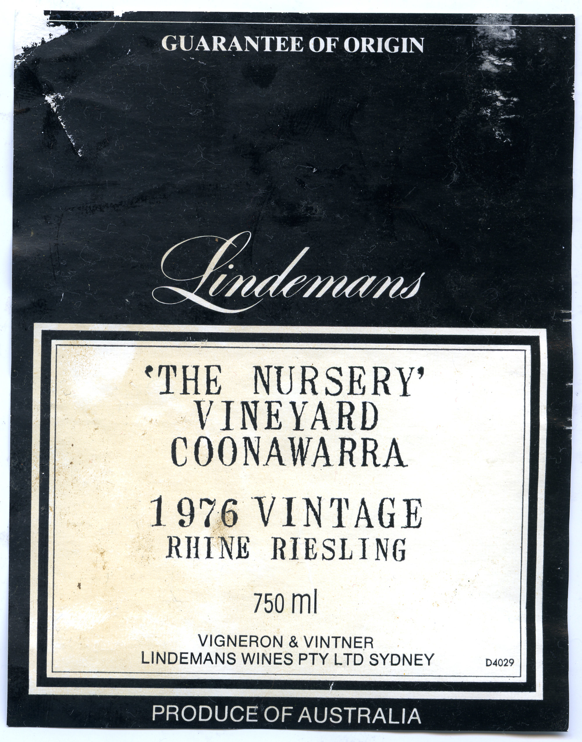 Label reads: "Guarantee of origin. Lindemans. 'The nursery' vineyard Coonawarra. 1976 vintage Rhine Riesling. 750ml. Vigneron and Vintner. Lindemans Wines Pty Ltd Sydney. Produce of Australia."