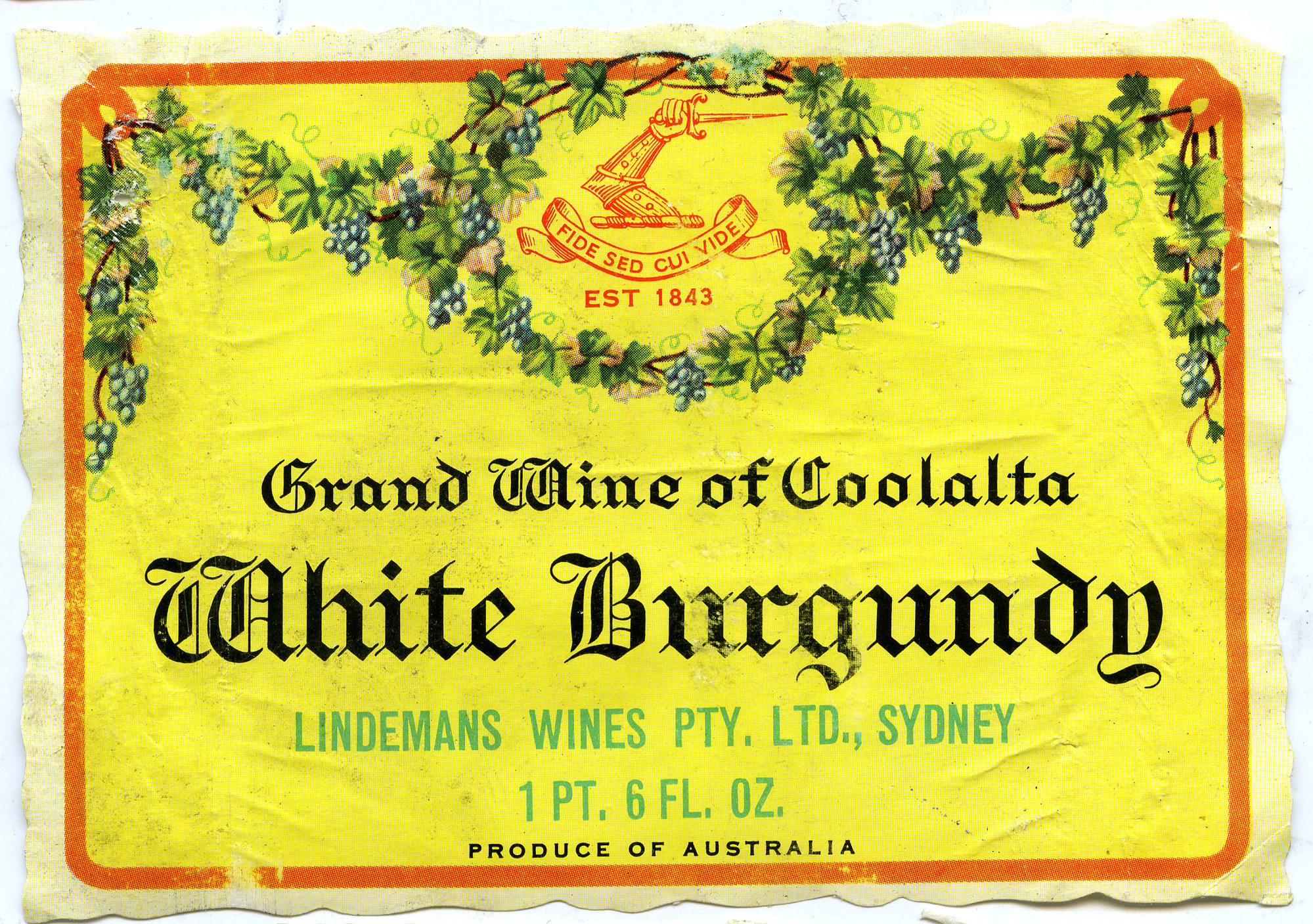 Label reads: "Est 1843. Grand wine of Coolalta. White Burgundy. Lindemans Wines Pty. Ltd., Sydney. 1 pt. 6 fl. oz. Produce of Australia."